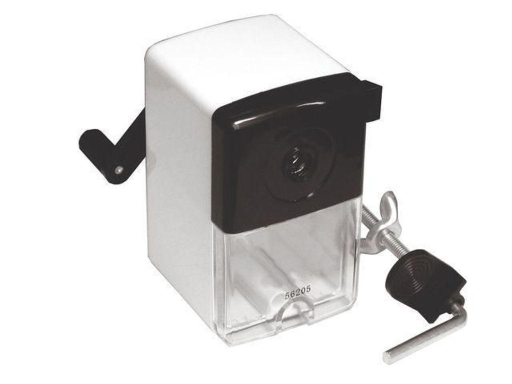 Högkvalitativ pennvässare för bordet. Pennvässare med vev med en konstruktion i ABS-plast och metall som ger vikt för stabilitet. Uppsamlingsburk i plast samt bordstving och klämma medföljer. - Med vev - Bordsmodell - Automatstop - Färg: Vit - För pennor upp till 8 mm i diameter - Funkar inte för Jumbo-pennor -