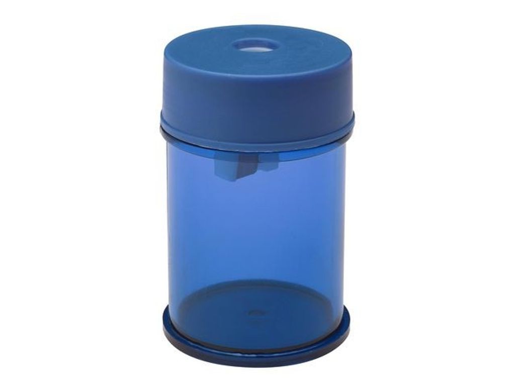 Pennvässare med praktisk behållare som samlar upp spånrester. För blyerts och färgade stift upp till 8 mm i diameter. Hållbar vässare I metall. - Färg: Transparant blå - Material: vässare I metall, behållaren i polystyren och polypropen