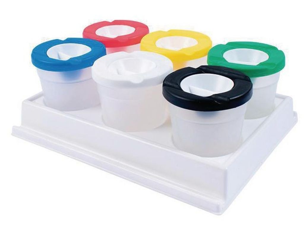 Praktisk penselmugg för kreaktiva tillfällen. Mindre penselmuggar som står stadigt i sitt ställ. Det smarta och färgglada locket gör att du enkelt kan separera dina färger. Förpackning med 1 bricka och 6 muggar. - Antal: 6 st penselmuggar och 1 st plastbricka - Mått penselmuggar Ø 78 mm, höjd 88 mm - Mått plastbricka (BxLXH): 25,5x19,5x3,5 cm - Material: PP och PE-plast