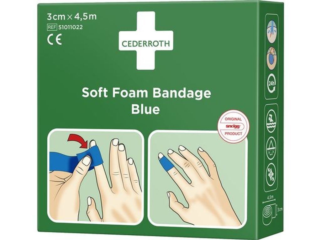 Cederroth Soft Foam Bandage fungerar både som plåster och som bandage och är lämplig för mindre sår. Idealiskt för snabb och enkel sårvård! CEDERROTH Soft Foam är lätt att applicera och passar perfekt för fingrar och tår. Lätt att linda runt små händer eller när du har ett mindre sår.¿ Förbandet passar på alla typer av små sår oberoende av värme, kyla, vått eller torrt och sitter kvar även i vatten. Det är ett självhäftande limfritt plåster och klibbar därför inte fast i hud eller hår. Riv enkelt av en passande bit och linda runt det skadade området. Den blå färgen syns bra och är lämplig att använda vid livsmedelshantering. Askarna kan användas som dispenser genom att dra ut Soft Foam genom den avsedda öppningen. Riv av en bit efter behov. ¿ - Färg: Blå - Mått: 3cm x 4,5m