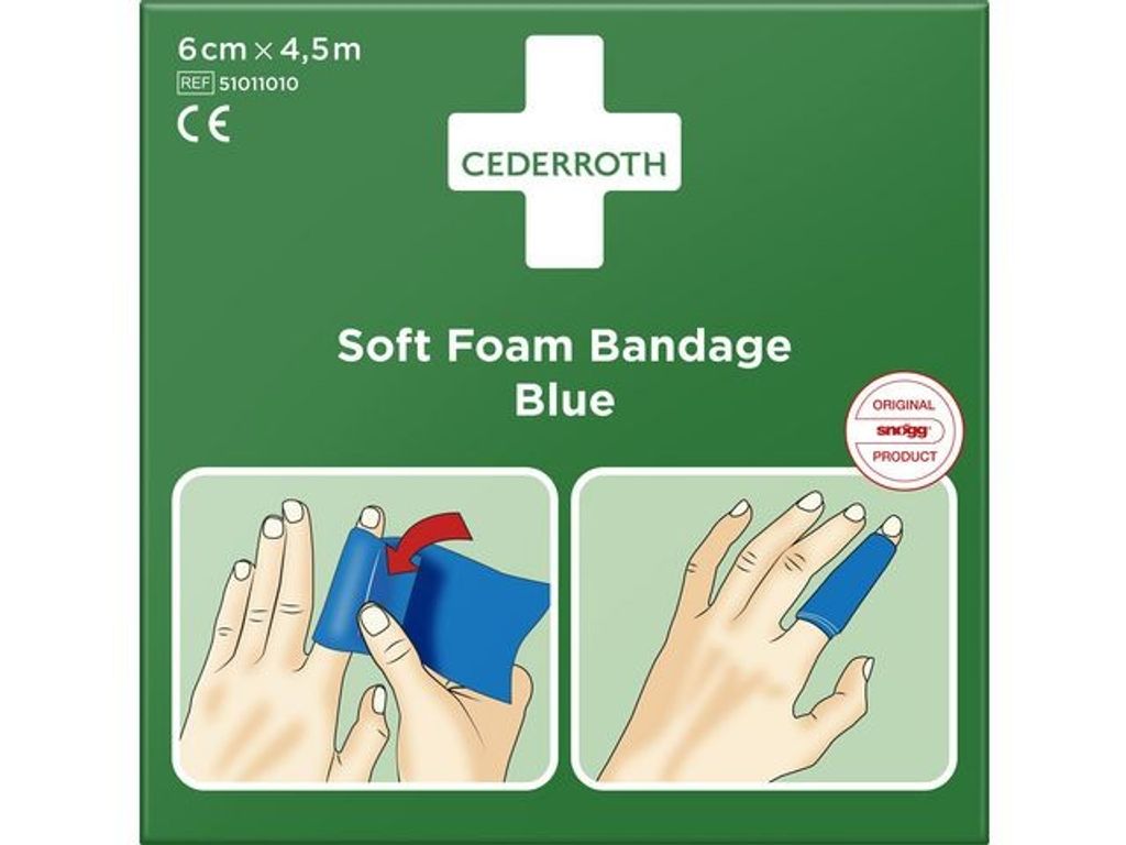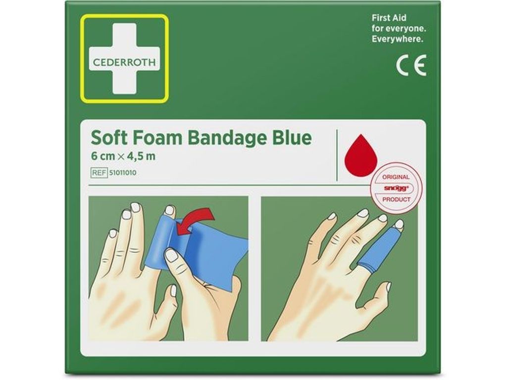 Cederroth Soft Foam Bandage fungerar både som plåster och som bandage och är lämplig för mindre sår. Idealiskt för snabb och enkel sårvård! CEDERROTH Soft Foam är lätt att applicera på fingrar, händer, armar, tår, fötter och ben med mera. Förbandet passar på alla typer av små sår oberoende av värme, kyla, vått eller torrt och sitter kvar även i vatten. Det är ett självhäftande limfritt plåster och klibbar därför inte fast i hud eller hår. Riv enkelt av en passande bit och linda runt det skadade området. Vid kraftig blödning, forma en bit Soft Foam Bandage som en ”kudde” för att skapa ett tryckförband. Passar som refill till Wound Care Dispenser eller Soft Foam Bandage Dispenser. - Färg: Blå - Mått: 6cm x 4,5m