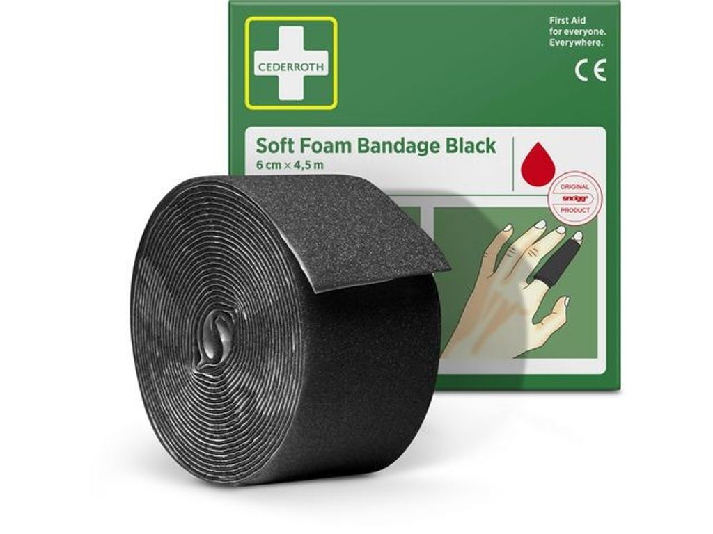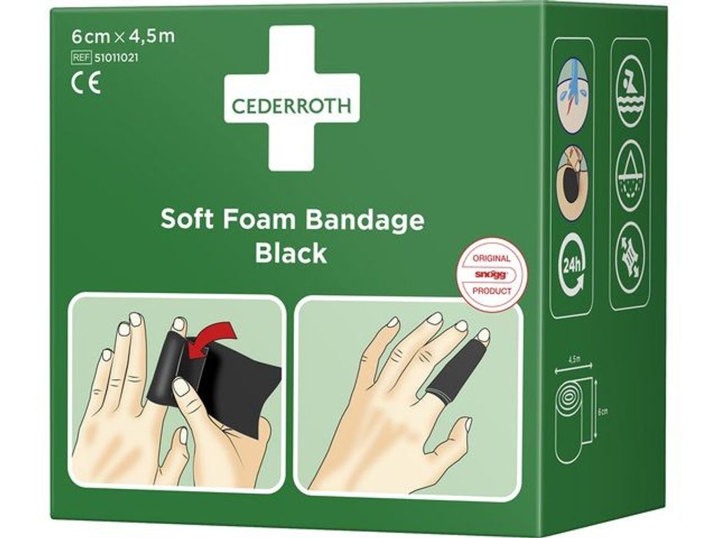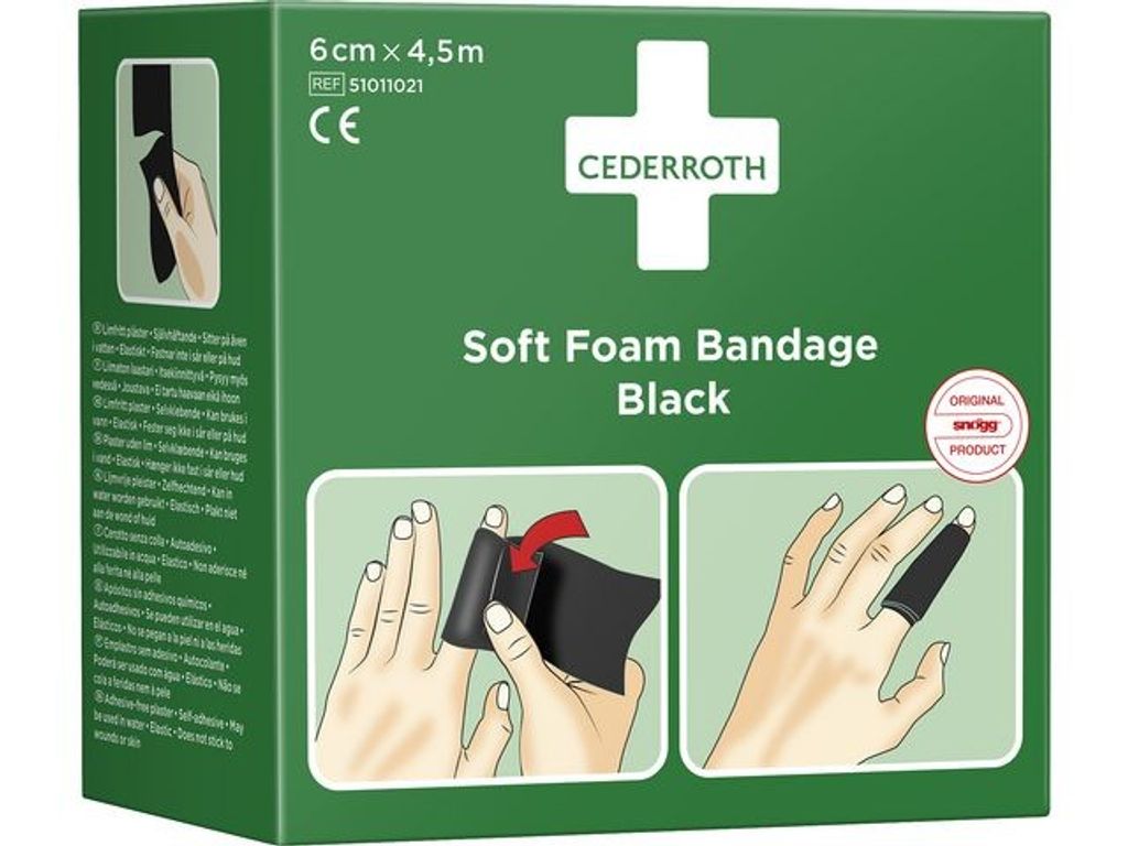 Cederroth Soft Foam Bandage fungerar både som plåster och som bandage och är lämplig för mindre sår. Idealiskt för snabb och enkel sårvård! CEDERROTH Soft Foam är lätt att applicera på fingrar, händer, armar, tår, fötter och ben med mera. Förbandet passar på alla typer av små sår oberoende av värme, kyla, vått eller torrt och sitter kvar även i vatten. Det är ett självhäftande limfritt plåster och klibbar därför inte fast i hud eller hår. Riv enkelt av en passande bit och linda runt det skadade området. Vid kraftig blödning, forma en bit Soft Foam Bandage som en ”kudde” för att skapa ett tryckförband. Passar som refill till Wound Care Dispenser eller Soft Foam Bandage Dispenser. Svart färg rekommenderas för smutsig arbetsmiljö då den kamouflerar fläckar på förbandets utsida. Askarna kan användas som dispenser genom att dra ut Soft Foam genom den avsedda öppningen. Riv av en bit efter behov. ¿ - Färg: Svart - Mått: 6cm x 4,5m