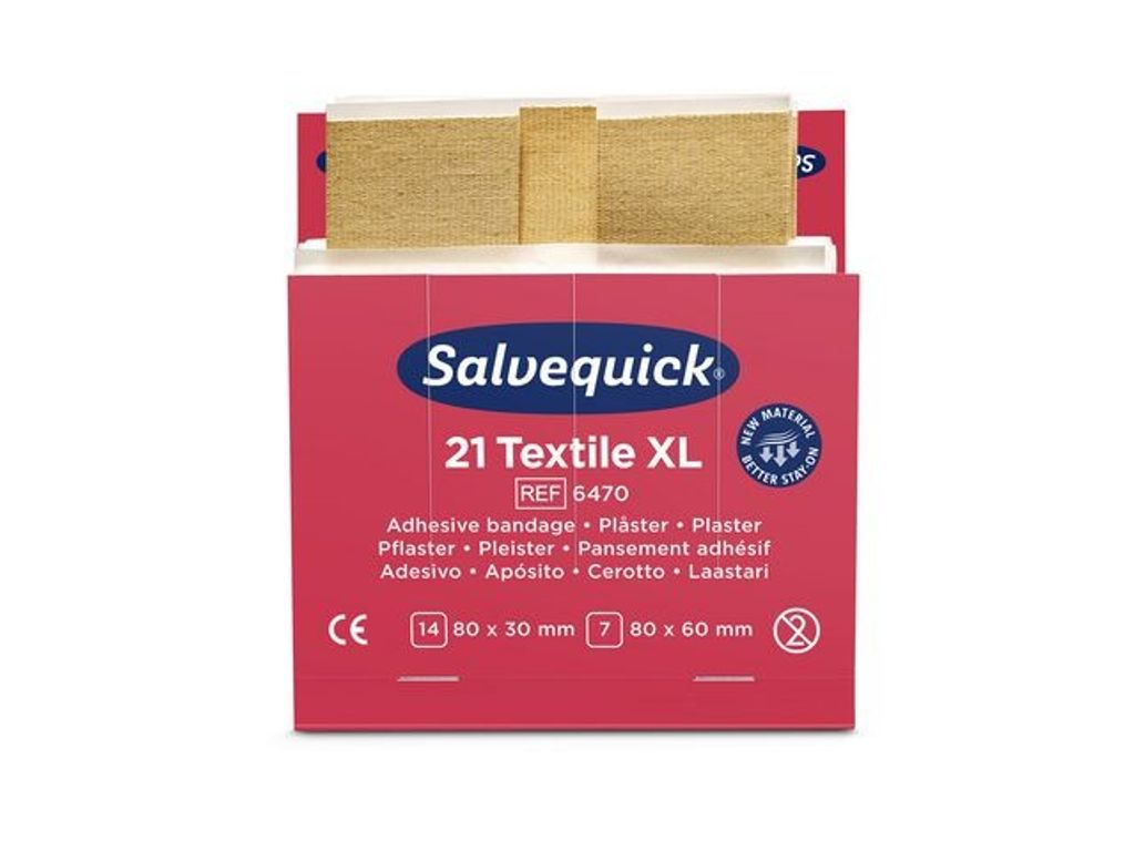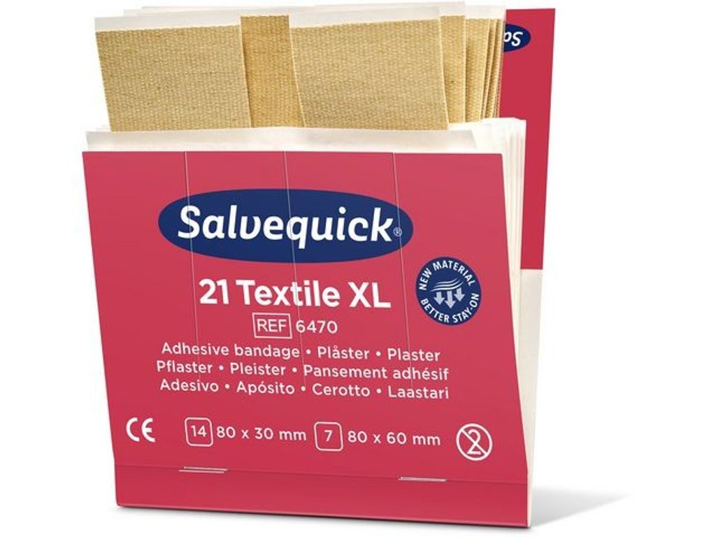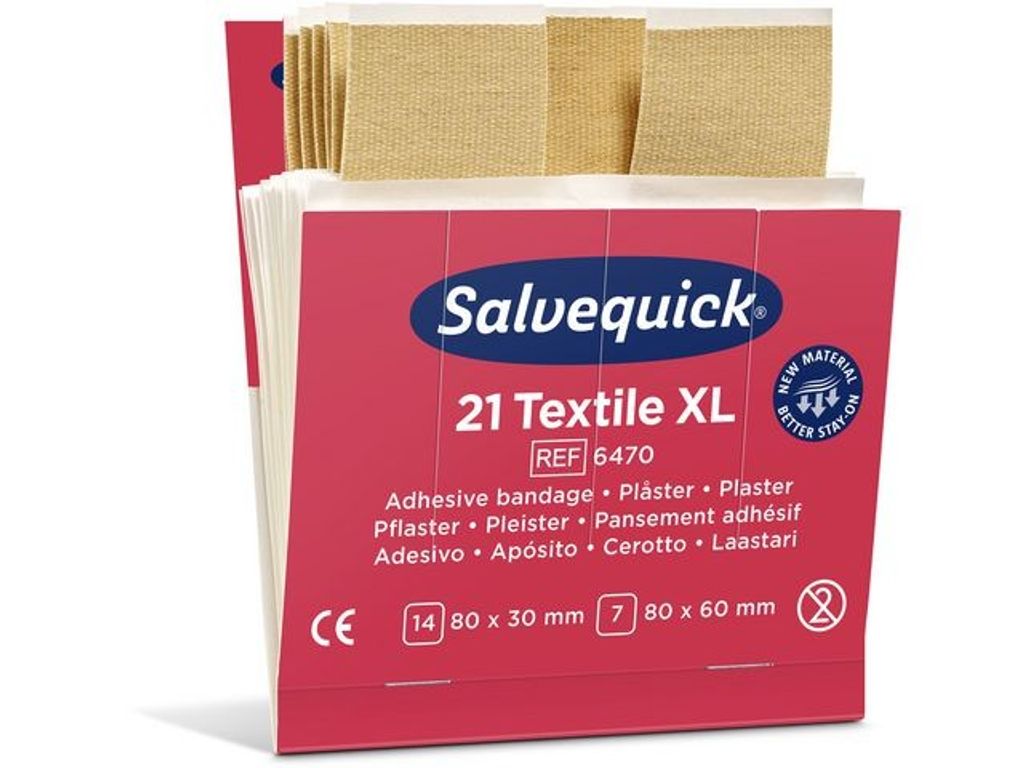 Refill till Cederroth plåsterautomat. Salvequick Extra Stora Textilplåster är rejäla, lite större plåster av hög kvalitet. Plåstren är allergitestade. De är lätta att applicera, flexibla och smidiga att använda. - Allergitestade - Innehåll: - Varje refill innehåller 21 plåster (14 st 80x30mm och 7 st 80x60mm). - 6 refiller/ask