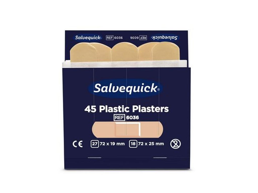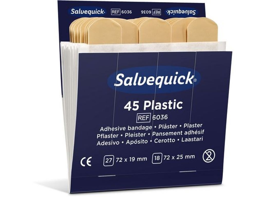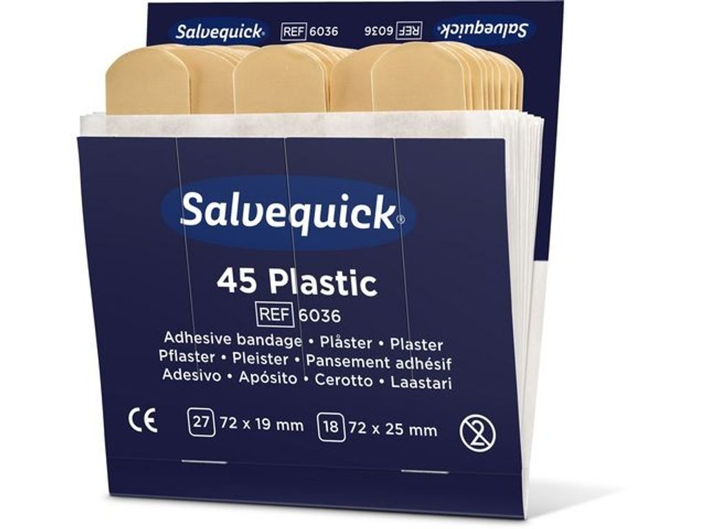 Salvequick CE-märkta plåsterrefill som passar till Cederroth plåsterautomat. Salvequick Plastplåster är smidiga plåster av hög kvalitet. Plåstren är allergitestade. De är lätta att applicera, flexibla och smidiga att använda. - Ce-certifierade - Allergitestade - Innehåll: - Varje refill innehåller 45 plåster (27 st 72x19mm och 18 st 72x25mm) - 6 refiller/ask