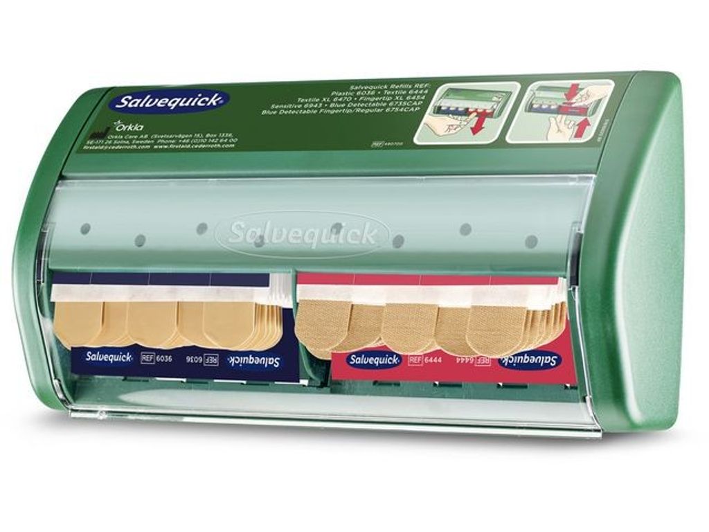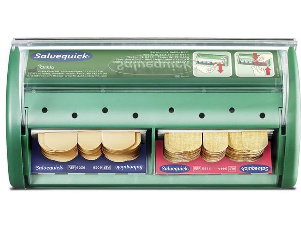 Salvequick Plåsterautomater och Plåster är ett komplett och lättanvänt system. Plåstren finns alltid på plats, färdiga att använda. I Salvequick Plåsterautomat dras plåstren nedåt. På så sätt undviker man att smutsa eller blöda ner övriga plåster. - Innehåll: - 1 nyckel - 40 textilplåster (REF 6444) och 45 plastplåster (REF 6036). - Varje refill har två storlekar på plåster: 72 x 19 mm och 72 x 25 mm. - Mått: B 23 x H 12 x D 5,5 cm