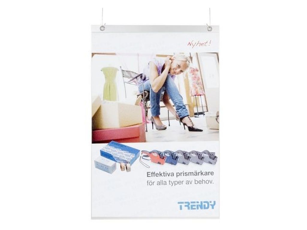Frihängande plastficka för affischer i A3 format. Plastfickan har öljetter i överkant med cc mått 25cm. Nederkant av fickan har ett uppvik som håller affischen på plats. - Storlek: A3 - Tillverkad i antireflexbehandlad PVC-plast - Frihängande med öljetter i ovankant