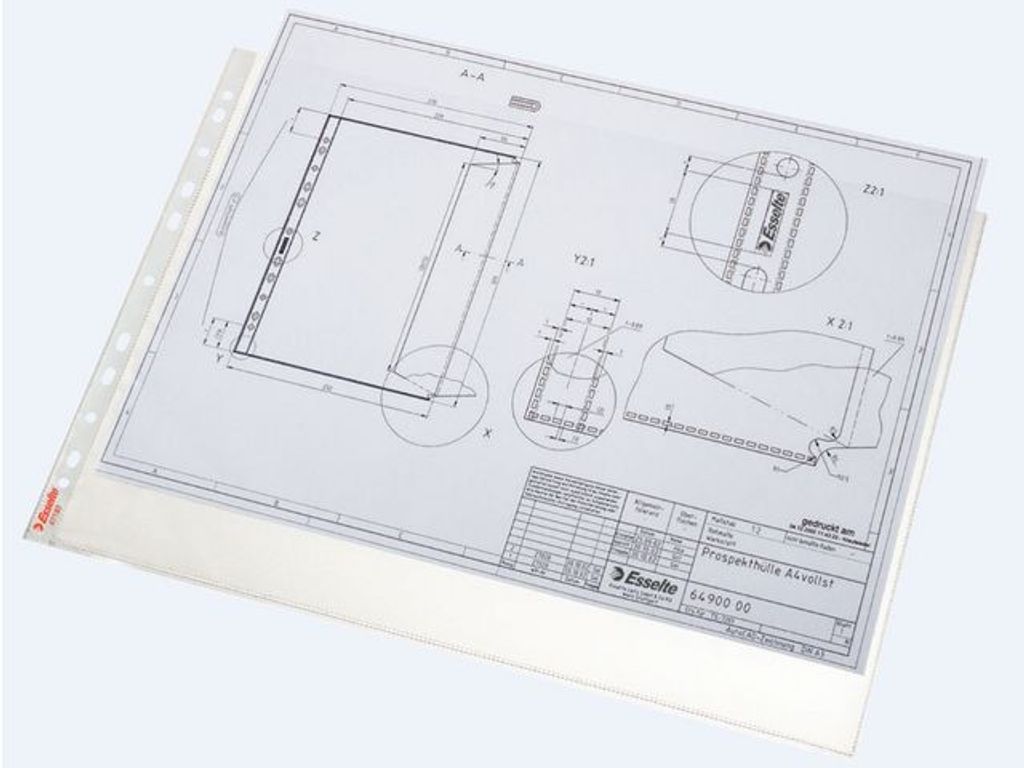Håll dina tekniska ritningar och projekt väl skyddad och organiserade med dessa stansade fickor från Esselte i liggande format. Dessa stansade fickor i A3-format från Esselte är tillverkade av polypropylen på 75 mikrometer, vilket gör dem slitstarka och tåliga. Den präglade ytan och klara färgen gör dem idealiska för presentationer och för att förvara viktiga papper på ett säkert sätt. Dokumentskydden har 11 hål, så de passar de flesta arkivmappar och ringpärmar. De är dessutom kopieringssäkra, vilket innebär att de kommer att hålla dina handskrivna och maskinskrivna papper i gott skick under längre tid. - Kopieringssäkra stansade fickor, liggande format - Öppning längst upp - Format som stöds: A3 - Hål: 11 - Material: Polypropylen - Tjocklek: 75 mikrometer - Färg: Genomskinlig