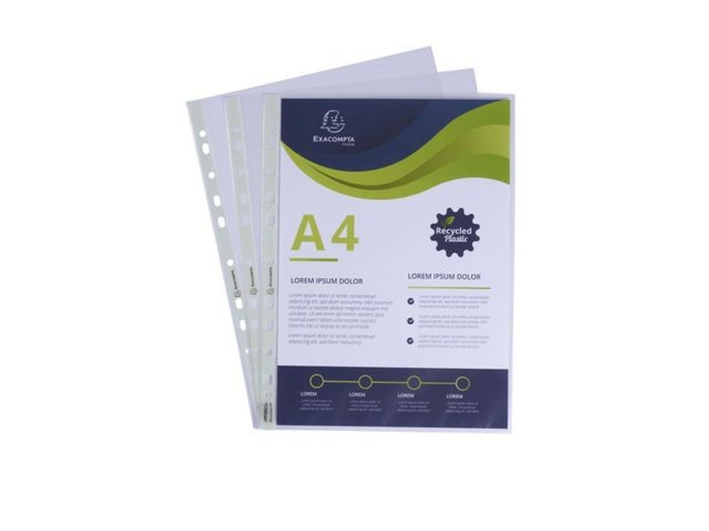 Plastfickor av återvunnen plast certiiferade med Blue Angel. Exacompta Forever stansade plastfickor för dagligt bruk är gjorda av återvunnet plastavfall och är certifierade med Blue Angel. De 0,6mm präglade polypropenfickorna har en förstärkt remsa med EU-hålning och levereras i en låda med 100 fickor. - Plastfickor för arkivering och förvaring av dokument - Tillverkad av återvunnet plastavfall - Certifierad Blue Angel - 60 mikron i tjocklek - Präglad yta - Förstärkt stansad remsa för användning i pärm
