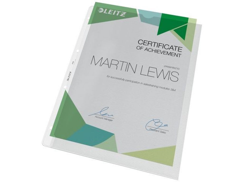 Ficka i toppkvalitet ficka för konstant användning. Multi-stansade hålremsa tillåter praktisk förvaring av dokument i olika pärmar.Präglad 0,13 mm återvinningsbar PP folie, Copysafe. Enkel åtkomst till dokument via urtaget och 2 öppna sidor. Öppen ovan- och vänstersida. 4 hål på hålremsan.