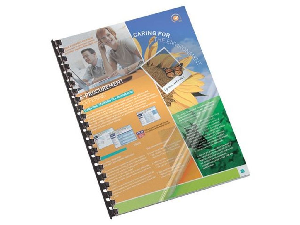 Beskrivning av Plastomslag LYRECO A4 200mic 100/fp Omslag för spiralbindning med fram- och baksida i plast. - I A4-format. - Tillverkat av 200 my PVC-plast.