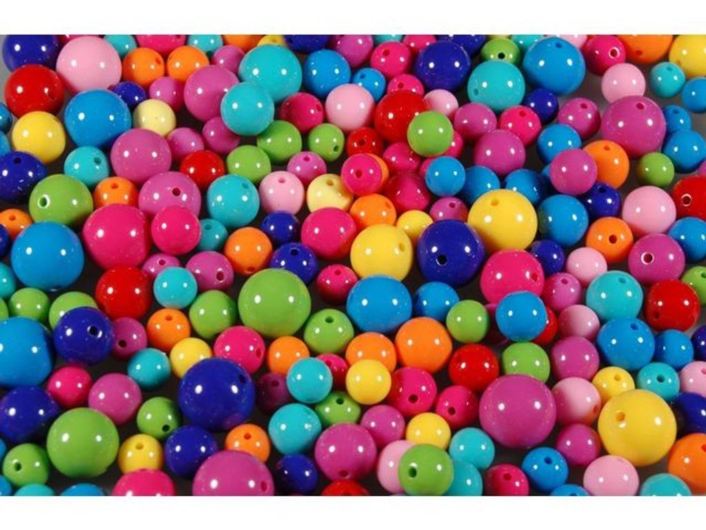 Plastpärlor runda. 12, 14, 16, 18 och 20 mm i klara sorterade färger. Håldiameter 2 - 3 mm.
