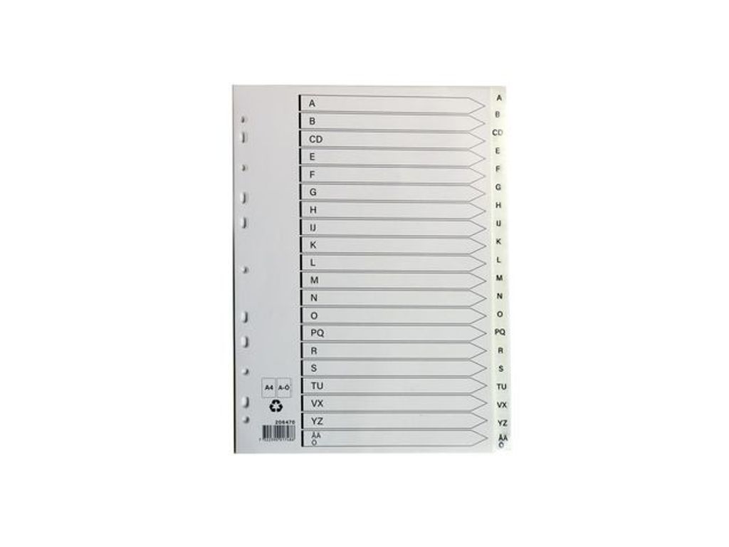 Organisera dina papper med dessa universalstansade, förtryckta register som är tillverkade av hållbar plast. Dessa förtryckta register är användarvänliga, stabila och ger enkel indexering och identifiering av innehållet i dina anteckningsböcker, pärmar och mappar. Registret har försättsblad av papper och förtryckta flikar så att du snabbt kan identifiera och hitta rätt material. Den hållbara plastkonstruktionen tål dagligt slitage och kan enkelt flyttas tack vare universalstansningen som fungerar med alla pärm- och arkiveringssystem. - Register A-Ö - Mått: A4 - Material: Plast (PP) - Färg: Vit - Tjocklek på plast: 110my eller 0,11mm