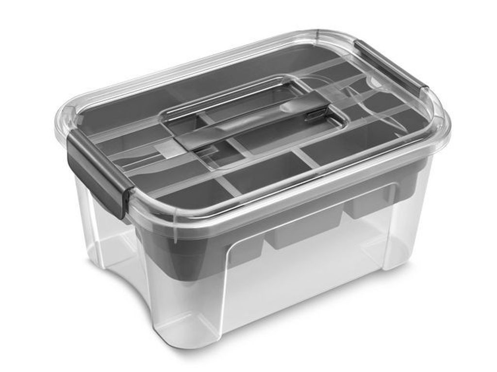 Idealisk för resor mellan kontoret - hemmet och flexkontoret. Lätt och praktisk. Fem fack för pennor, småsaker, smartphone etc. Lådan har bärhandtag. Livsmedelskontakt certifierad och godkänd. Håller säkert upp till 4 kg i vikt Organisering: 34,7 x 24,7 x h8,4 cm Användbara förvaringsmått på kartongen: 29 x 21 x h18 cm Ursprung: Luxemburg - Material: PP: 100% återvinningsbart - Färg: antracitgrå för handtag, clips och organizer. Transparent låda - Mått: - Kartong: 39 x 27,7 x h19,5 cm