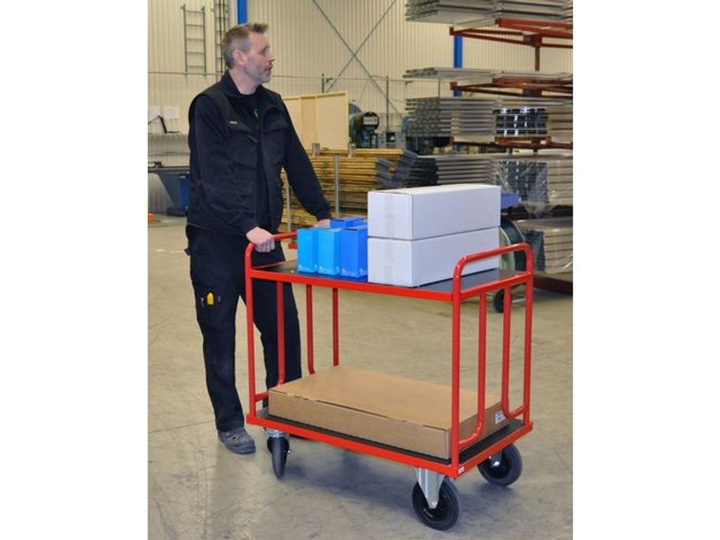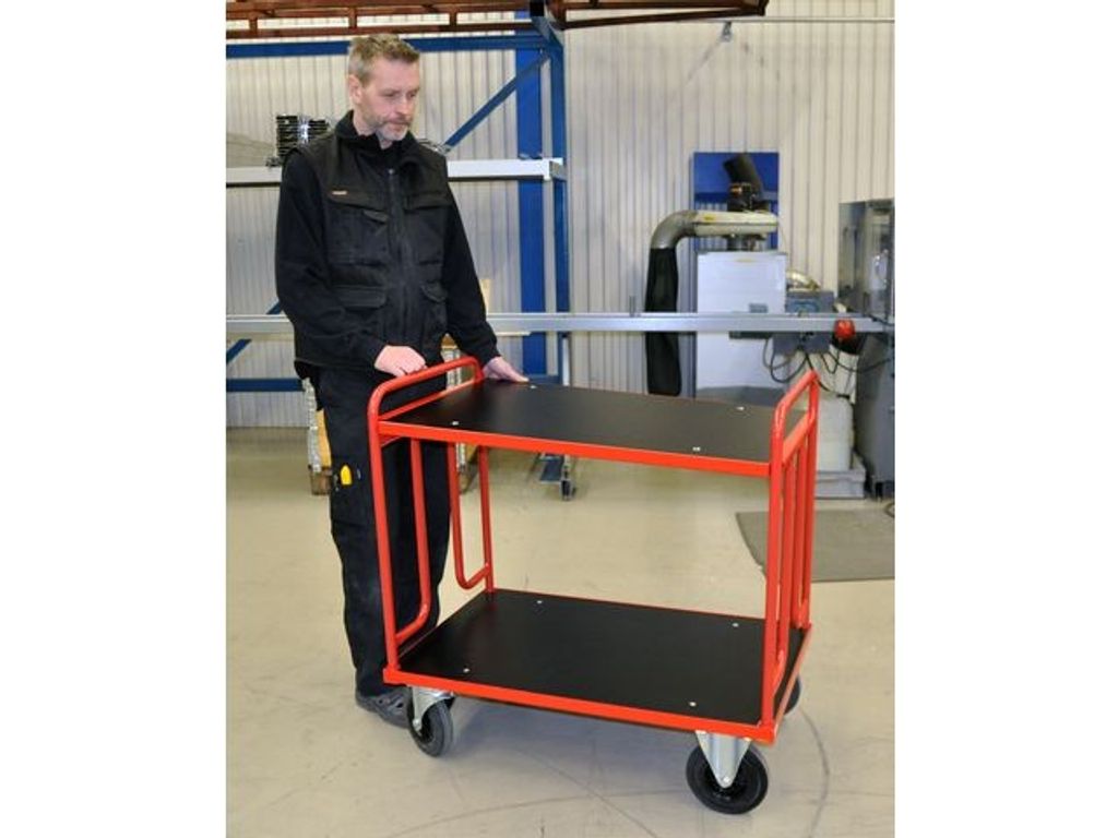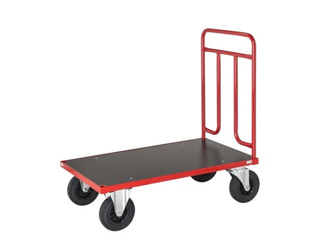 Röd plattformsvagn med brett användningsområde. Pulverlackerad vagn med laminatskiva samt gavel. - Belastning: 500kg - Storlek: 1000 x 600 x 1000mm (LxBxH) - Byglar: 25 mm stålrör - Höjd till lastplan: 260mm - Hjultyp: 2 fasta och 2 länkade massiva gummihjul, 200 x 50mm - Bromsad: Nej - Vagnens vikt: 26,5kg