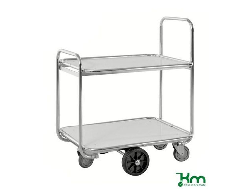 Smidig plockvagn i två plan. Mycket enkel att hantera även vid tyngre last och kan monteras med tre eller fyra länkhjul. Elförzinkad med laminatskiva. Levereras omonterad. - Belastning: 300kg - Storlek: 1300 x 630 x 1100mm (LxBxH) - Avstånd mellan hyllplan: 520mm - Höjd till övre hyllplan: 770 mm - Färg: Elförzinkad/vit - Vikt: 35kg - Bromsade hjul: Nej - Hjultyp: 4 länkhjul 125mm och 2 fasta 200mm