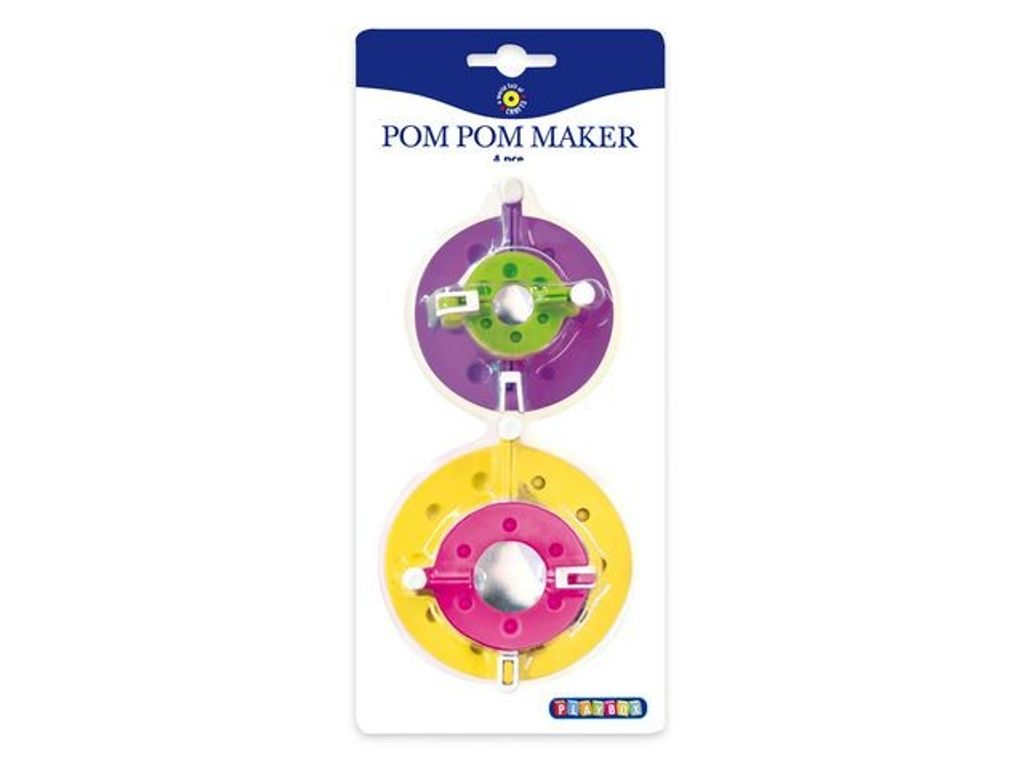 Pompomverktyg av plast i olika storlekar. Med verktyget är det lätt att tillverka alla slags pompomfigurer, vi rekommenderar akrylgarn till detta. - Antal: 4/fp - Mått: Ø 35 - 90mm - Färg: grön, rosa, lila och gul - Material: PS