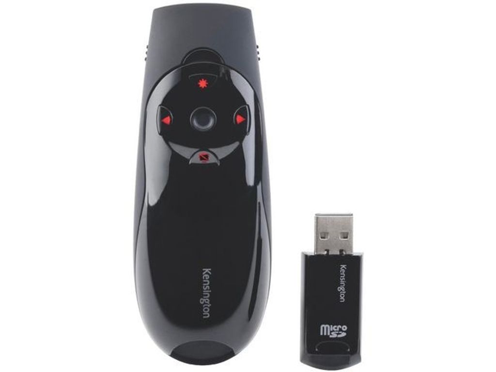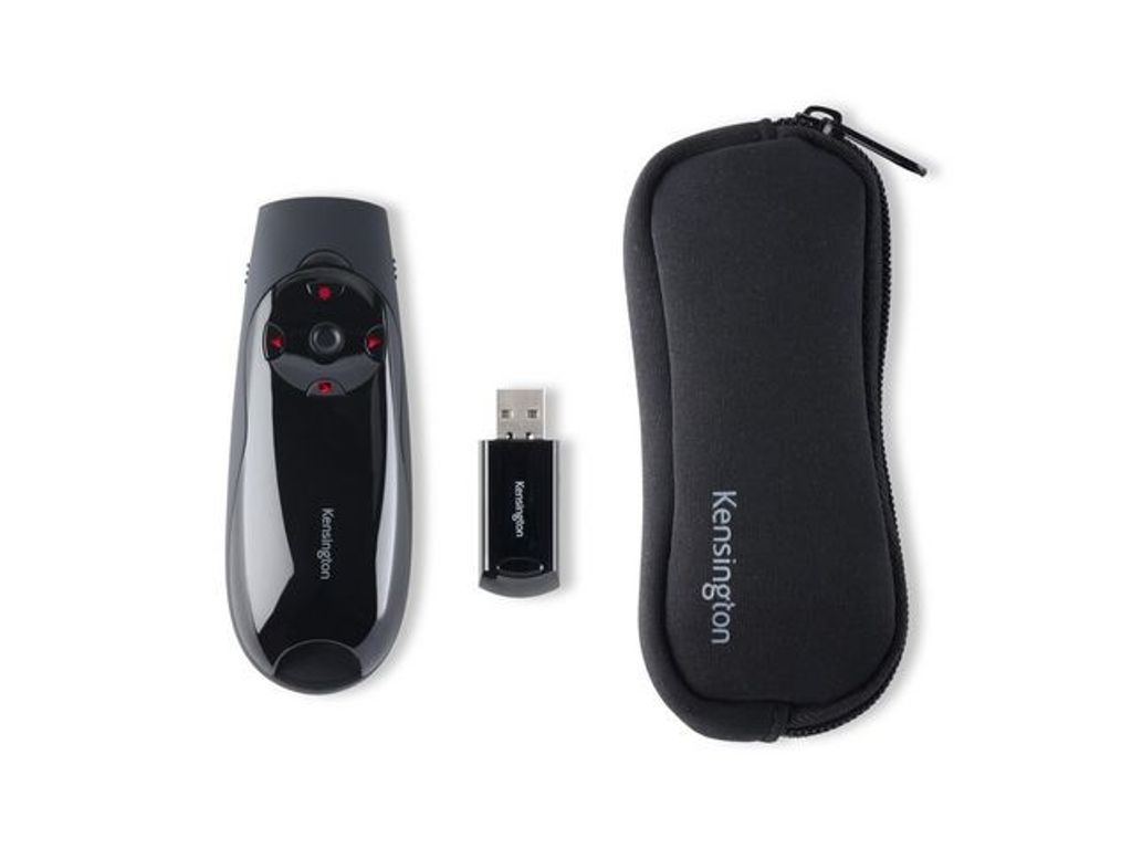 Denna Kensington Presenter Expert™ tar kontrollen av presentationer till en ny nivå. Den har en intuitiv fyrvägs joystick som presentatören kan använda som en mus med styrning upp/ned och vänster/höger. Bakgrundupplysta kontroller och en ergonomisk design bidrar med både bekvämlighet och komfort. Den trådlösa 2,4 GHz mottagaren förvaras inuti själva presentatören när den inte används. - Markörstyrning med en joystick låter dig använda presentatören som en mus och du kan flytta markören upp/ned och vänster/höger. - Knappkontroller med bakgrundsljus flyttar sidor framåt/bakåt, släcker skärmen och aktiverar den röda laserpekaren - Utökad 45 meter trådlös räckvidd för att nå hela rummet - Trådlös USB-mottagare förvaras i själva presentatören så att den inte försvinner - Med trådlös plug-and-play-anslutning kommer du igång snabbt och enkelt - Bekvämt grepp med speciella handkonturer