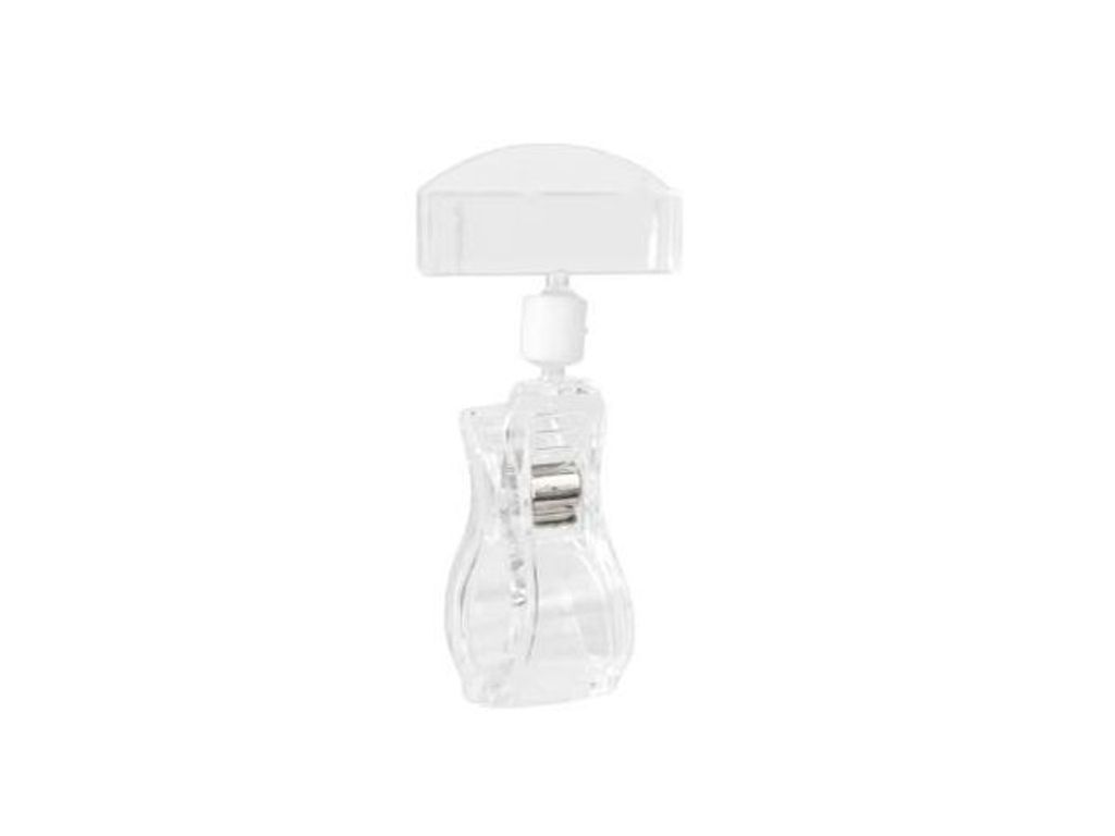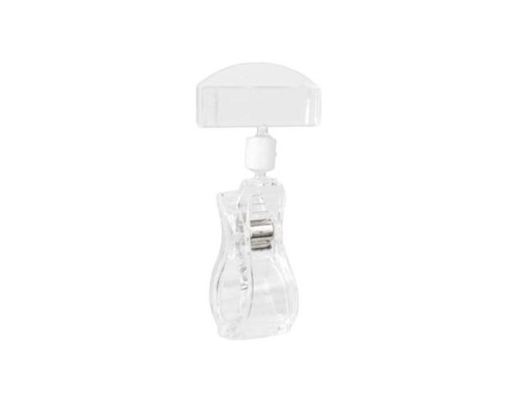 Flexibel prisklämma för att visa info och varupriser. Genomskinlig prisskyltshållare av större storlek med en ledad klämma. Klämman kan hålla material från 0-35mm i diameter. Mycket flexibelt hjälpmedel för att exponera pris och produktinformation. - Längd: 95mm - Skylthållarens mått: 50x22mm - Hyllklämmans mått: 27x58mm - Antal per förpackning: 10st - Material: polykarbonat