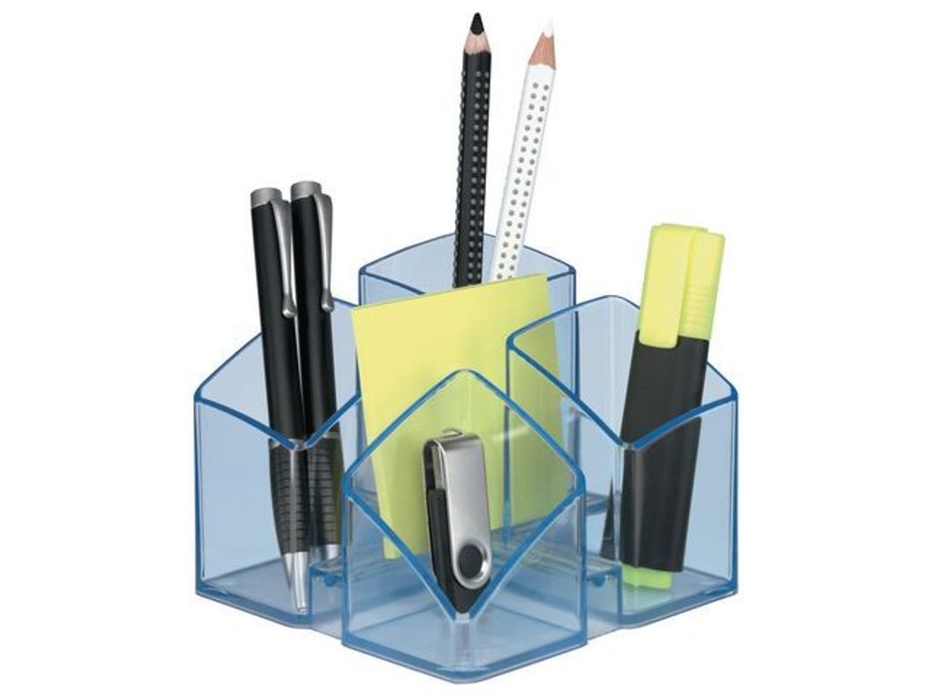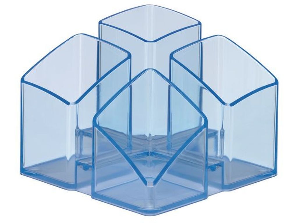 Exklusiv design möter funktion. Glansig färg. Högkvalitativt prylställ med 4 fack inklusive post-it och korthållare. De fyra facken i olika storlekar rymmer det du behöver på ett skrivbord, håller dem snygga och möjliggör snabb hantering. Kan kombineras och utvidgas individuellt. Robust, slitstark och stabil. - Halkfri på grund av gummimöbelskydd. Gjord i - Yttre mått (B x D x H): 125 x 125 x 100 mm - Material: Högkvalitativ polystyren - Färg: transparent-blå.