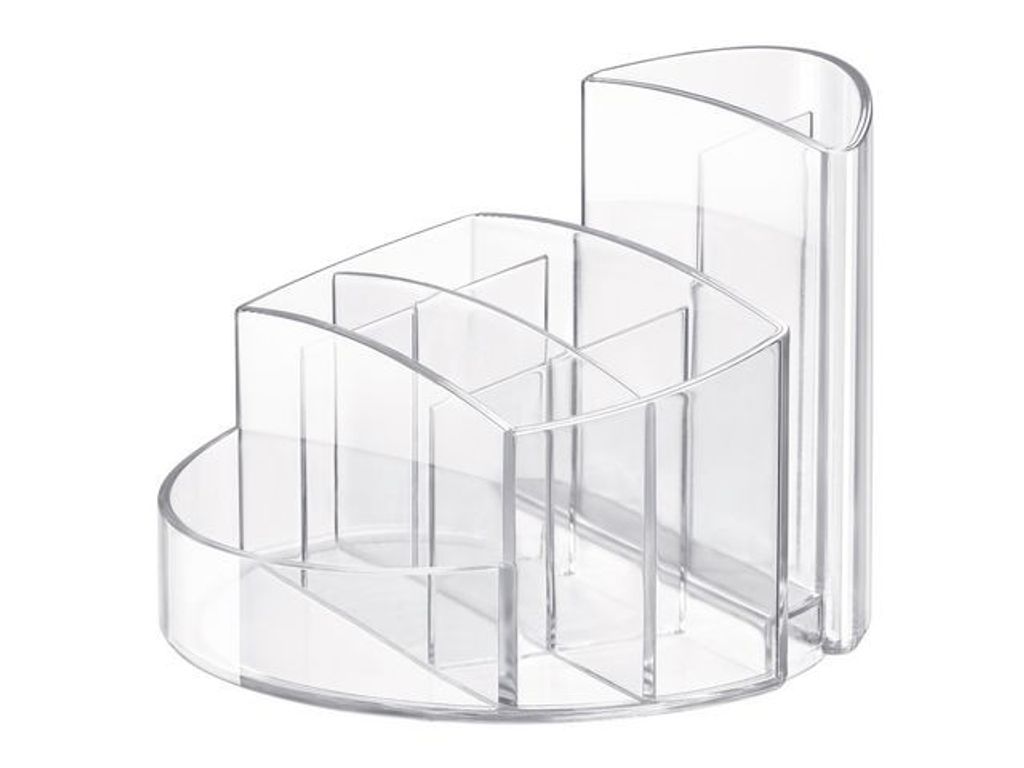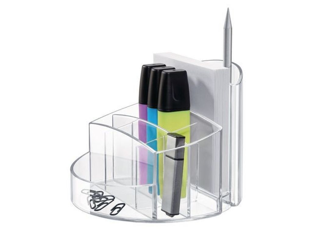 Tydlig, funktionell design kombinerad med högkvalitativt utförande och glansigt material. Sofistikerad, dynamisk men ändå elegant. 9 fack och smart post-och korthållare. Den här pennkoppen håller dina pennor och skrivbordsprylar snygga och rena och alltid nära till hands. Robust och stabil. - Yttre mått (B x D x H): 140 x 140 x 109 mm - Material: högkvalitativ polystyren - Gummifötter för att skydda mot repor - Färg: Transaparent