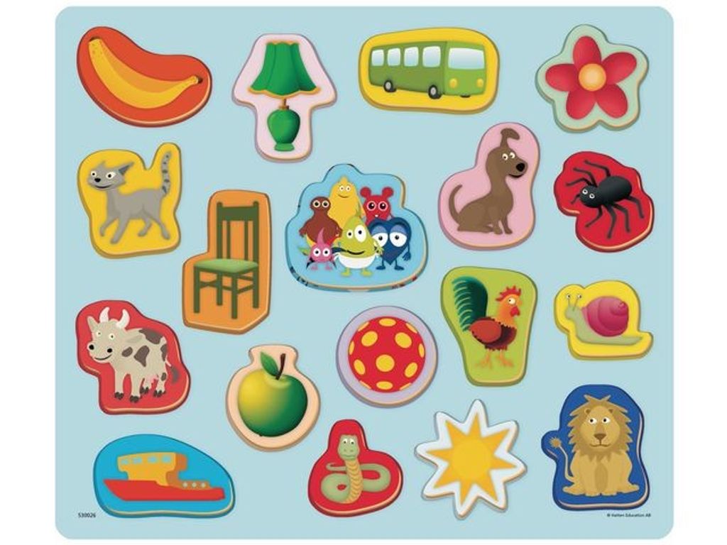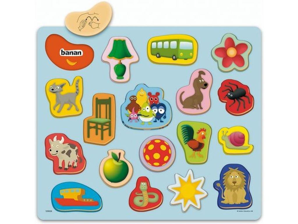 Träpusslet består av 18 stycken upphöjda bitar och föreställer Babblarna. Det här är ett roligt barnpussel för de minsta! På bitarnas framsida finns en bild målad, på bitarnas baksida finns en bild som genom gester förklarar bilden och under bitarna står ordet som beskriver vad bilden föreställer. Babblarna är väl genomtänkt språkträning. Den pedagogiska språkträningen riktar sig till barn i tidigt språkutveckling.