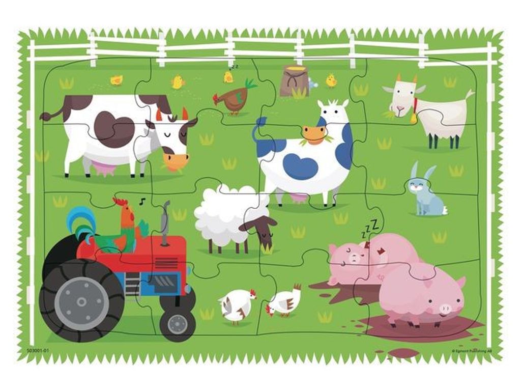 Pussel utvecklar barnens koordination och problemlösning Ett roligt rampussel som passar de minsta. Låt barnen lära sig om djuren på bondgården med stora bitar för enklare placering av pusselbiten. Lägg hästen, kaninen, fåren och kavlarna på rätt plats! Dessutom kan man med hjälp av en vuxen lära sig vilka de olika djuren är. - Antal bitar: 16 bitar - Rekommenderad ålder: 3+ år