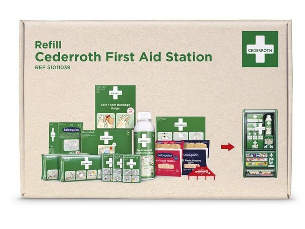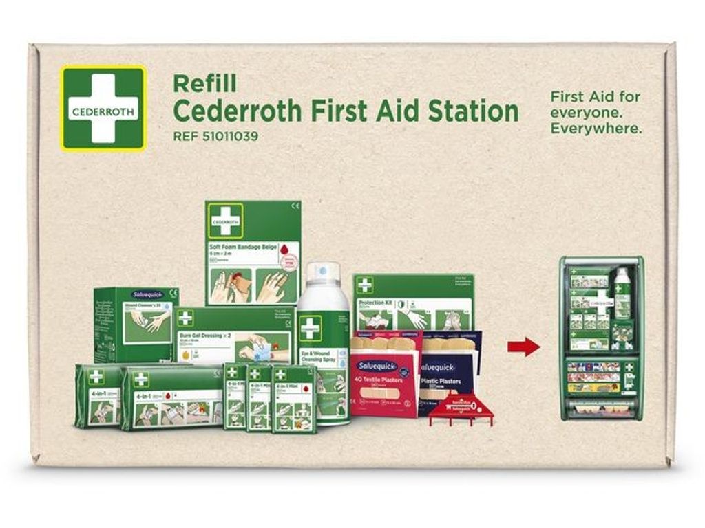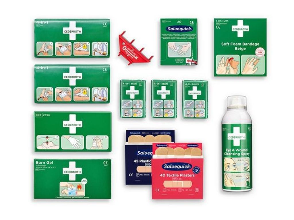 Ett komplett set med påfyllningsprodukter för Cederroths Första hjälpen-station, inklusive soft foam. Cederroth refillpaket till Första Hjälpen-station innehåller en komplett uppsättning refiller till stationen och är nu uppdaterad med 1 st Soft Foam Bandage Beige 6cmx2m. - Innehåll: - 2 x Cederroth 4-in-1 Blodstoppare (REF 1910) - 3 x Cederroth 4-in-1 mini Blodstoppare (REF 1911) - 1 x Cederroth Skyddspaket (REF 2596) - 1 x refill (45) Salvequick Plastplåster (REF 6036) - 1 x refill (40) Salvequick Textplåster (REF 6444) - 1 x box (20) Salvequick Sårtvättare (REF 323700) - 1 x Eye & Wound Cleansing Spray (REF 726000) - 1 x box (2) Cederroth Burn Gel Kompress (REF 901900) - 1 x Cederroth Soft Foam Bandage Beige 6cmx2m (REF 51011019) - 1 x Refill nyckel