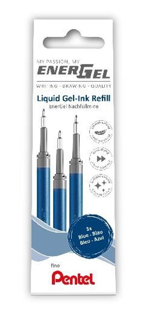 Refill till EnerGel 0,5 mm - 3-pack 3 st refiller med EnerGel gelbläck i samma färg. Välj mellan svart, rött och blått. Refillpatronen har en kuldiameter på 0,5 mm och en linjebredd på 0,25 mm. LRN5-3 kan användas till alla påfyllbara EnerGel-pennor. Hos Pentel tänker vi på hållbarheten. Därför kan du få refiller till många av våra produkter. Det finns ju ingen anledning att kasta en bra penna bara för att bläcket tagit slut. Färg: blå Linjebredd: 0,25 mm Kuldiameter: 0,5mm Spetstyp: rollerball Dye ink