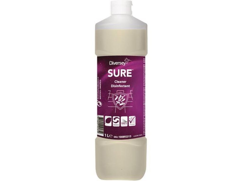 Ett säkert och miljömedvetet desinfektionsmedel för alla ytor där mat tillagas. SURE Disinfektionsmedel från Diversey är ett miljömedvetet och väldigt effektivt val. Lösningen är växtbaserad, 100 % biologiskt nedbrytbar och använder förnybara energikällor. Detta koncentrerade desinfektionsmedel är idealiskt för desinficering av alla ytor, t.ex. golv, bänkar, spisar och allmän utrustning. Det är idealiskt för användning där mat tillagas, för att döda bakterier och hålla platser sanitära. SURE-serien erbjuder professionella rengöringsprodukter som är utformade för att uppfylla kraven på effektivitet och tar även hänsyn till miljön och människors hälsa. Alla produkter är vegetabiliska och tillverkade av förnybara energikällor som är 100 % biologiskt nedbrytbara och utformade för effektivitet. - Högeffektivt miljövänligt rengöringsmedel och desinfektionsmedel - Tillverkad av 100 % biologiskt nedbrytbart material - Växtbaserat rengöringsmedel från förnybara källor - Desinficerar ytor såsom golv, bänkar, spisar och allmän utrustning - Dödar bakterier - Perfekt för användning där mat tillagas - Certifiering: EU Ecolabel - Etikettfärg: Lila - Volym: 1 l