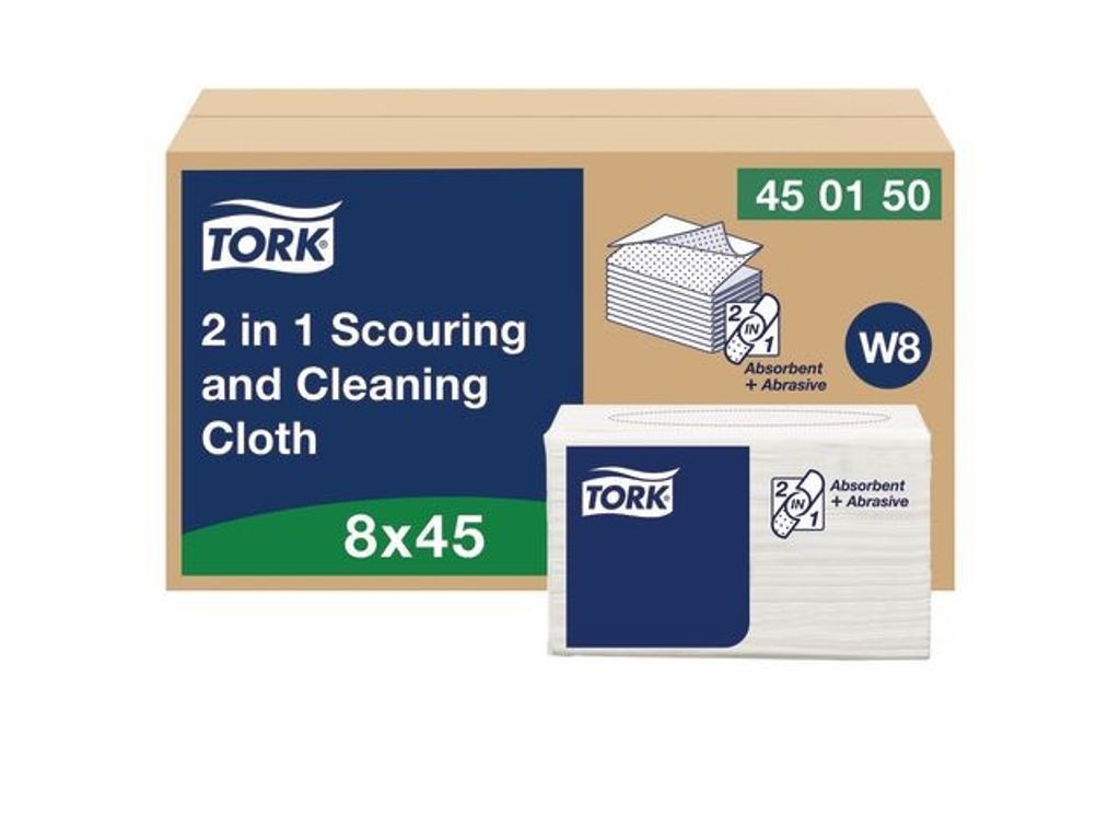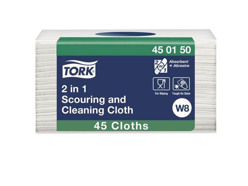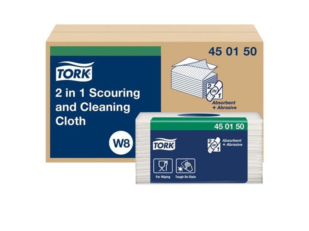 Förbättra effektiviteten vid städning med denna 2-i-1 skur- och rengöringsduk. Duken är både slitstark och absorberande för att klara av envisa fläckar, samtidigt som den har en design som är skonsam mot ytor och förhindrar repor. Den är dessutom flexibel, vilket gör att den enkelt kan rengöra svåråtkomliga platser. Dessa skur- och rengöringsdukar kan återanvändas upp till 10 gånger för att minska avfallet. Undvik skador på bordsskivor, tack vare professionella och högkvalitativa design som rengör utan att repa ytor. Kompatibel med Tork W8 dispensrar. - Rengör utan att repa ytor - Kan sköljas av och återanvändas flera gånger - 1-lagers vit - Premium-kvalitet - Vikt storlek: D 19.3cm x B 15cm - Ovikt storlek: D 38.5cm x B 30cm - Material: bomull och viskos