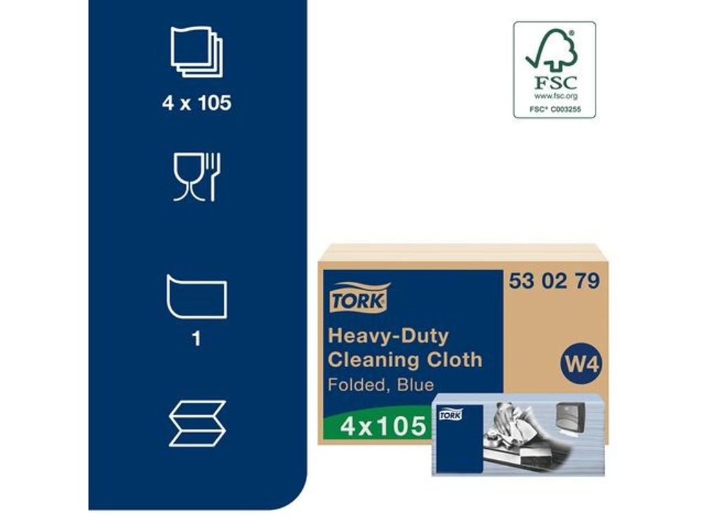 Allround rengöringsduk för grov rengöring. Ta enkelt hand om svårt spill med denna kraftiga och absorberande rengöringsduk. Den kan användas med de flesta lösningsmedel och skyddar händerna för en säker och problemfri städning. Skydda händerna från värme och metallspån under städningen, tack vare rengöringsdukens kraftiga material. Tork Easy Handling förpackning är enkel att bära och utmatningen av en duk i taget förbättrar hygienen och minskar avfallet. Kompatibel med Tork W4-dispensrar för rengöringsdukar. - Absorberar olja, fett och vätskor - Slitstark och hållbar för upprepad användning - Kraftig kvalitet för att skydda händerna - Kompatibel med Tork W4-dispensrar - 1-lagers, blå - Vikt storlek: L 10,8cm x B 35,5cm - Ovikt storlek: L 41,5cm x B 35,5cm - Material: cellulosamassa, polyester och polypropylen