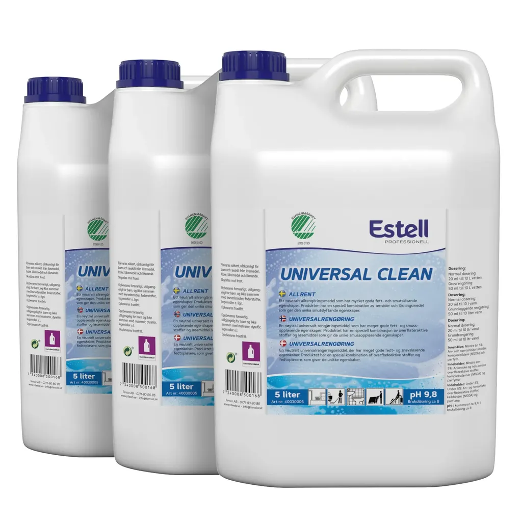 Estell Allrent är ett flytande neutralt allrengöringsmedel med mycket goda fett och smutslösande egenskaper. Produkten är speciellt sammansatt för att ge produkten smutslyftande egenskaper och ge ett rent resultat och en ren smutsavvisandeyta redan vid låg dosering. Kan användas på alla slags hårda vattentåliga ytor exempelvis plastgolv, linoleum, stengolv, målade ytor, kakel, sanitetsgods och rostfritt. Till oljade trägolv, gummi och stengolv är såpa ett bättre alternativ.