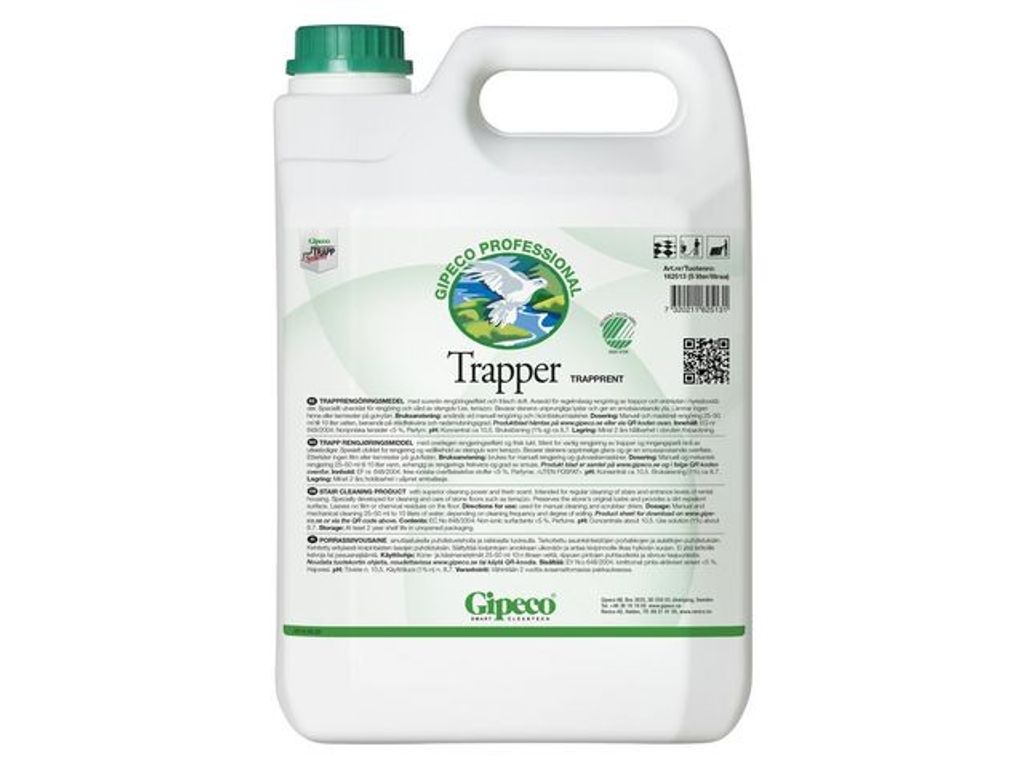 Gipeco Trapper är ett lågskummande trapprengöringsmedel som ger ett utmräkt resultat och fräsch doft. Detta rengöringsmedel speciellt framtaget för rengöring och vård av stengolv och regelbunden rengöring av trappor och entréplan i hyresbostäder. Rengöringsmedlet bevarar stenens ursprungliga lyster och ger dessutom en smutsavvisande yta. Produkten lämnar inga kemrester och ingen hinna på den rengjorda ytan. - pH-värde (koncentrat): ca 10,5 - pH-värde (brukslösning 1%-ig): ca 8,7 - Dosering : 25-100 ml till 10 liter vatten, beroende av städfrekvens och nedsmutsningsgrad - Volym: 3x 5 Liter - Svanen: Licensnummer 30260158