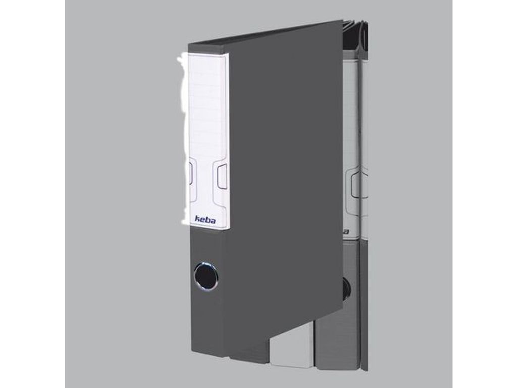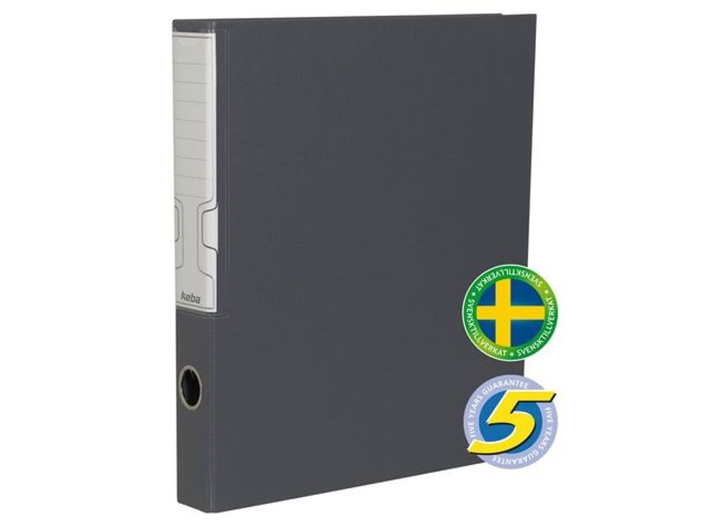 Beskrivning av Ringpärm-D KEBA grafitgrå PP-belagd D-ringpärm med stor etiketthållare och fingergrepp. Svensk mekanism. Ryggbredd 40 mm. A4-format.