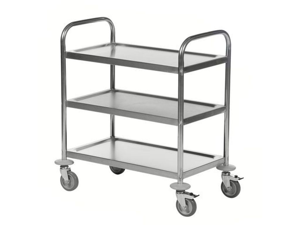 Enkel rostfri vagn i tre plan som passar i de flesta områden. Med släta hyllplan som gör den lätt att torka av. Med fyra länkhjul varav två är bromsade. Levereras omonterad. - Belastning: 100kg - Storlek: 710 x 400 x 805mm - Storlek hyllplan: 685 x 380mm - Höjd till övre hyllplan: 680mm - Avstånd mellan hyllplan: 200mm - Hjultyp: 4 länkhjul, 100mm - Bromsade hjul: Ja - Vagnens vikt: 12,3kg