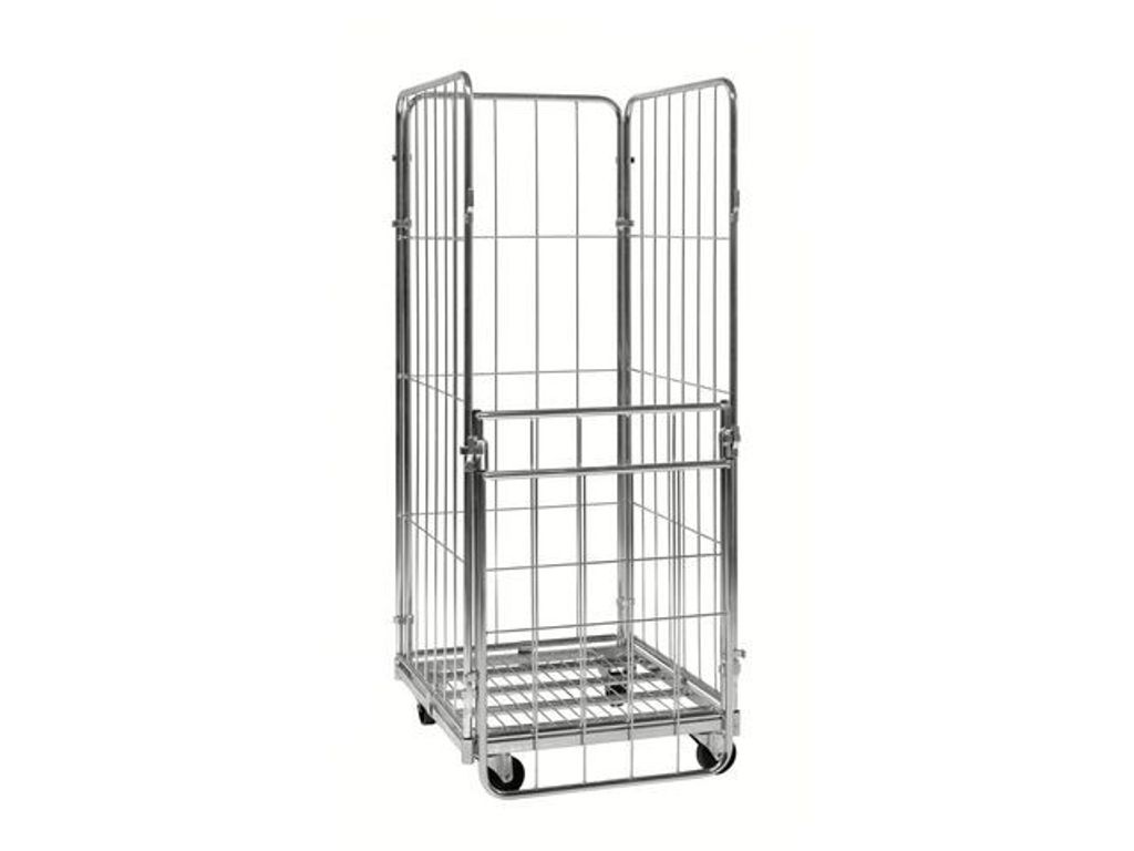 Rullcontainer med 4 sidor och en grind som går att fälla, alternativt ta bort helt. Enkel montering utan verktyg. Levereras omonterad. Elförzinkad. - Belastning: 400kg - Storlek: 1200 x 800 x 1800mm (LxBxH) - Invändigt mått: 1140 x 800 x 1640mm - Hjultyp: 2 fasta och 2 länkhjul, 100mm - Bromsade hjul: Nej - Maska: 105 x 350mm - Vagnens vikt: 47kg