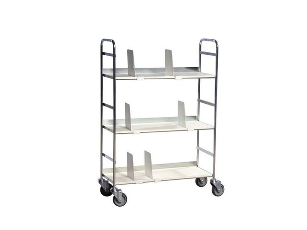 Vagn med tre hyllplan, perfekt för pärmar och böcker. Med vit laminatskiva och helsvetsat elförzinkat stativ. Levereras med 6 pärmstöd. - Belastning: 75kg (25kg/hyllplan) - Storlek: 750 x 290 x 1140mm (LxBxH) - Höjd till översta hyllan: 890mm - Avstånd mellan hyllplanen: 350mm - Hjultyp: 4 länkhjul, 100mm - Bromsade hjul: Nej - Vagnens vikt: 24,5kg