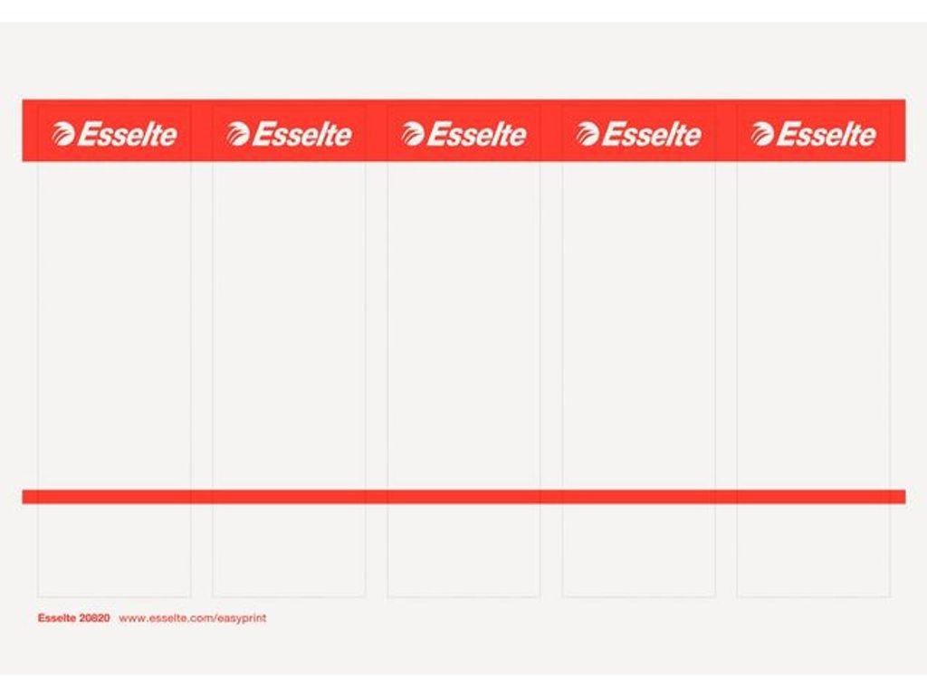 Utskrivbara ryggetiketter som hjälper till att organisera hyllorna och arkiv. Det användarvänliga, webbaserade verktyget EasyPrint designar och skriver ut etiketterna för att passa dina personliga önskemål. - Utskrivbara ryggetiketter via pc, för snabb och enkel organisation av pappersarbetet - Breda, korta, kartongetiketter för enkel insättning i ryggfickan - Stansade A4 ark för enkel hantering - Passar alla Esselte Plast LAF-pärmar bred (75 mm) - 1 fp med 10 A4 ark (5 etiketter per ark = 50 etiketter)