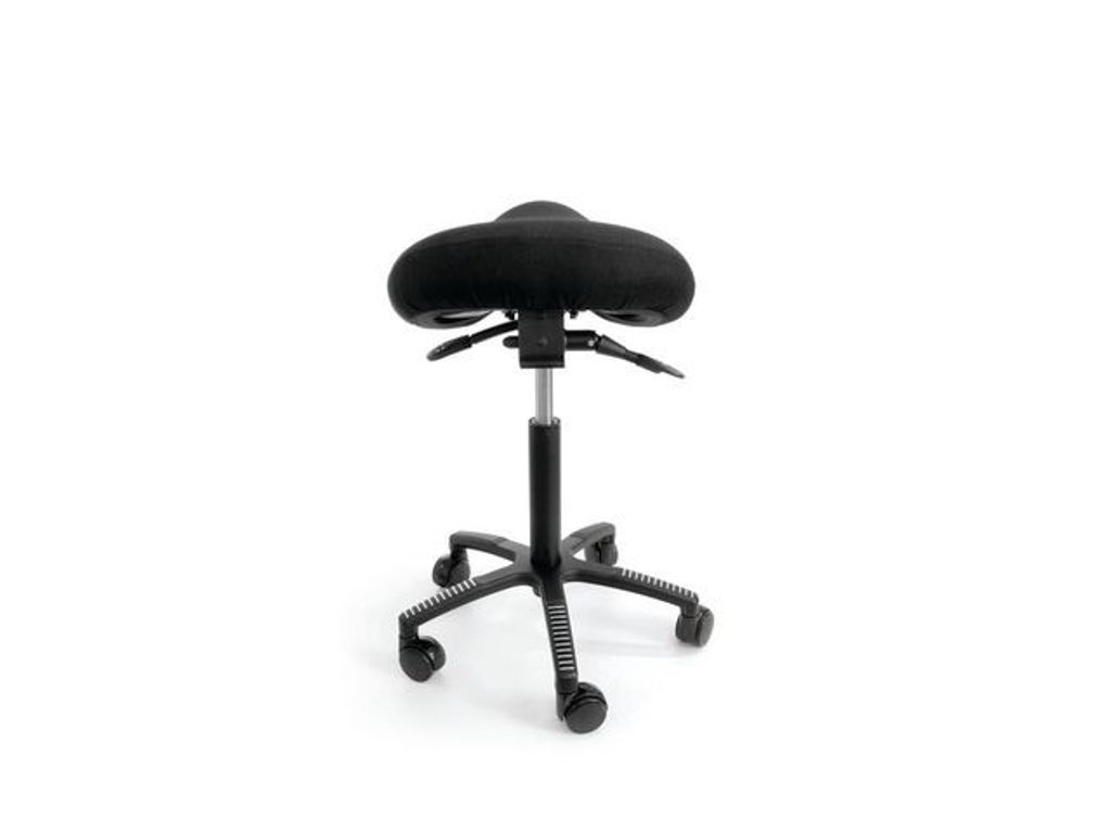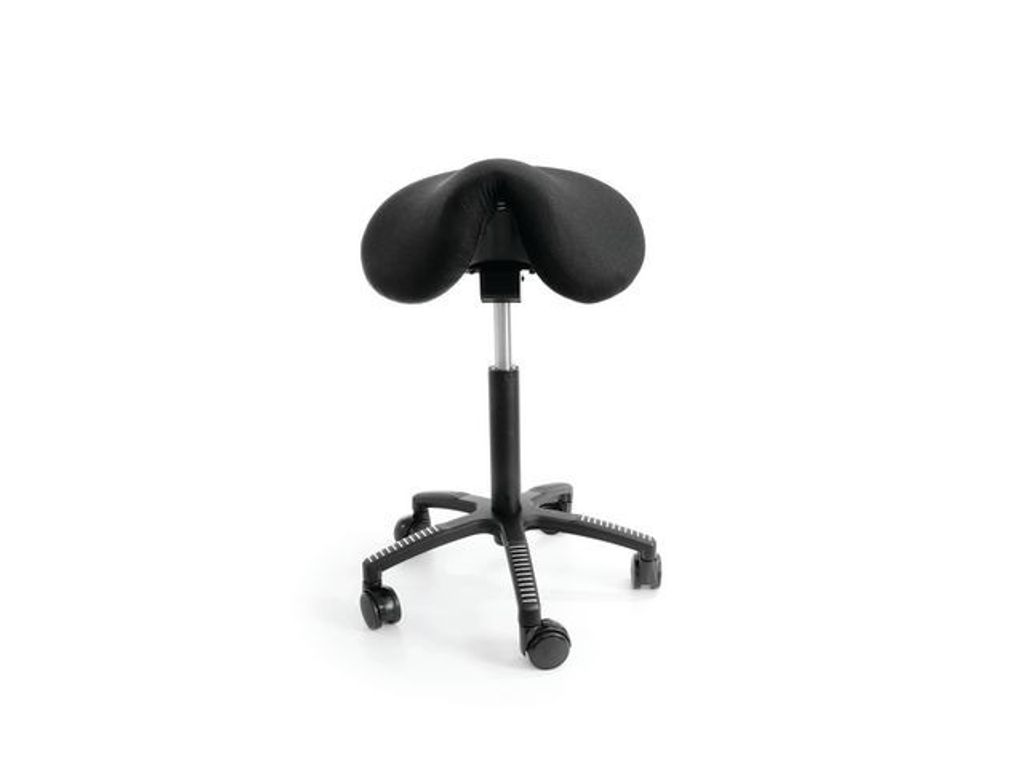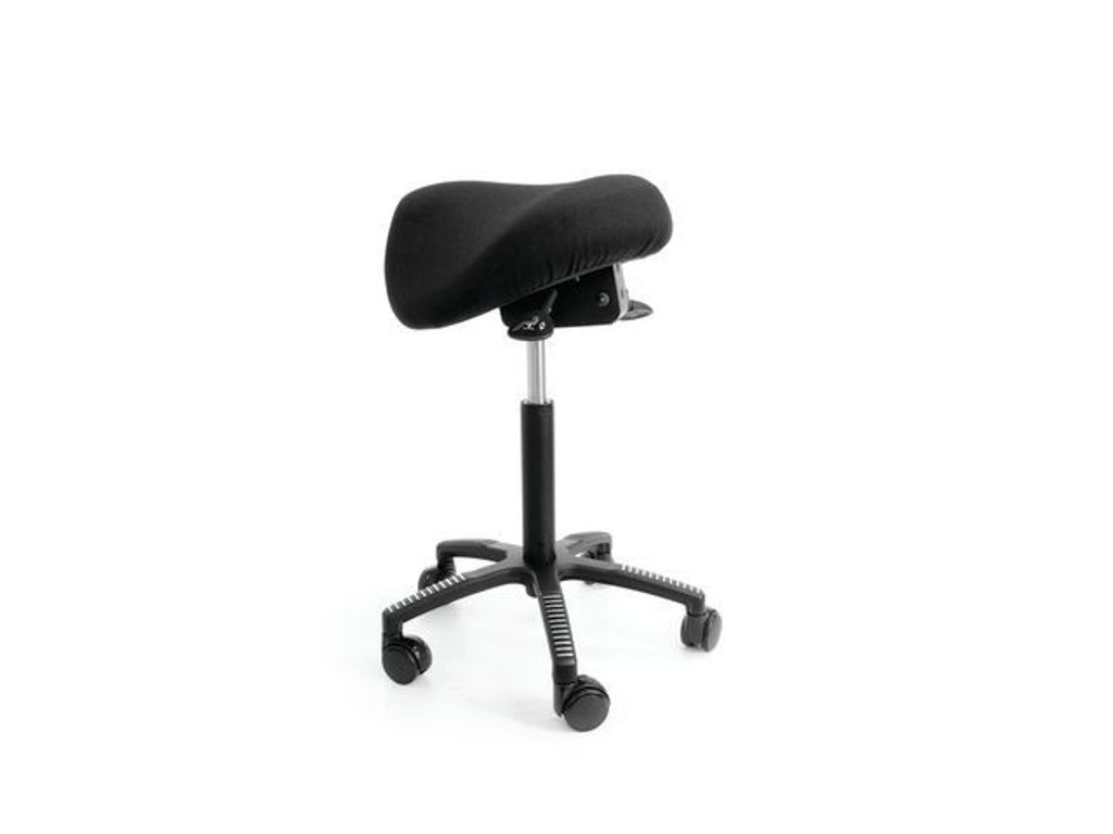 Mjuk och hållbar sadelstol som ger en bra arbetsställning och är utformad för en bra ergonomi. Softsadelstolens sits är individuellt inställbar i både vinkel och höjd. Sittdynan har en mjuk stoppning som formar sig efter användaren och ger god avlastning av sittknölarna. Svart fotkryss och gaspelare. - Klädsel: Tyg - Färg: Svart - Sitthöjd 60 – 81 cm - Diameter på stolsbenen är 500 mm