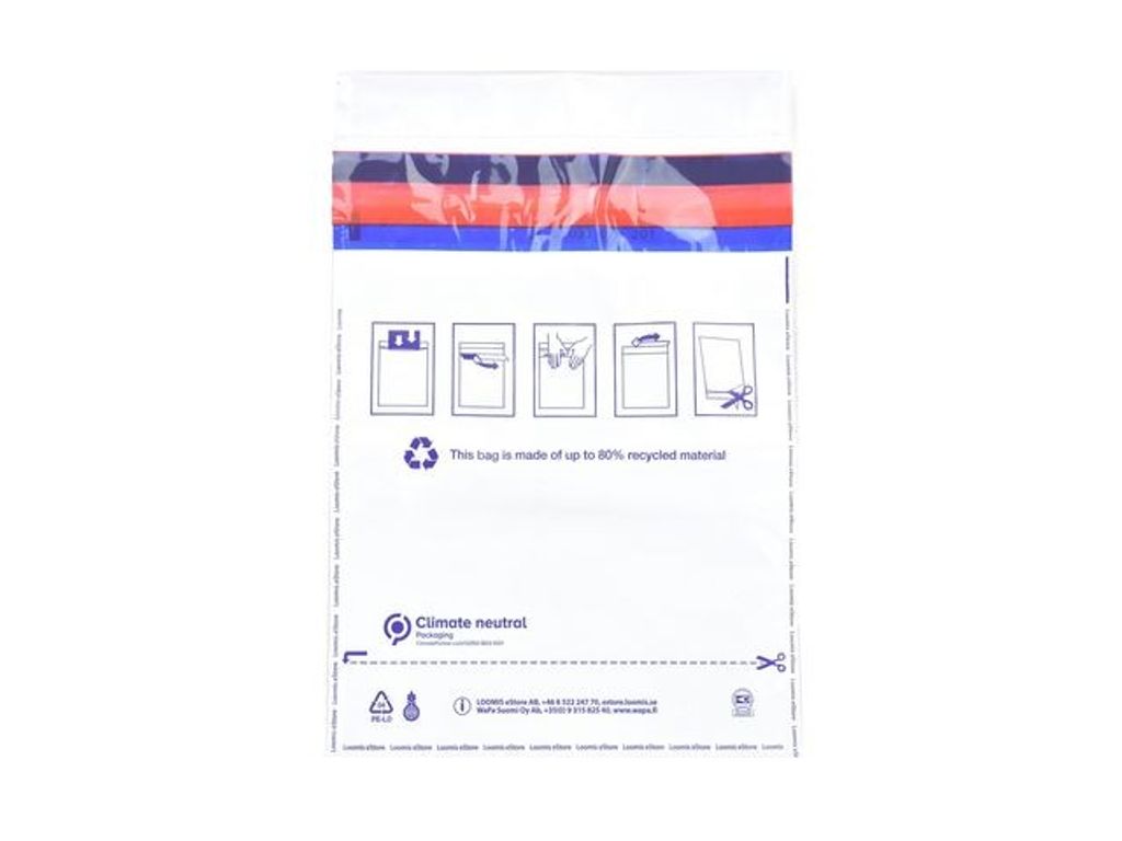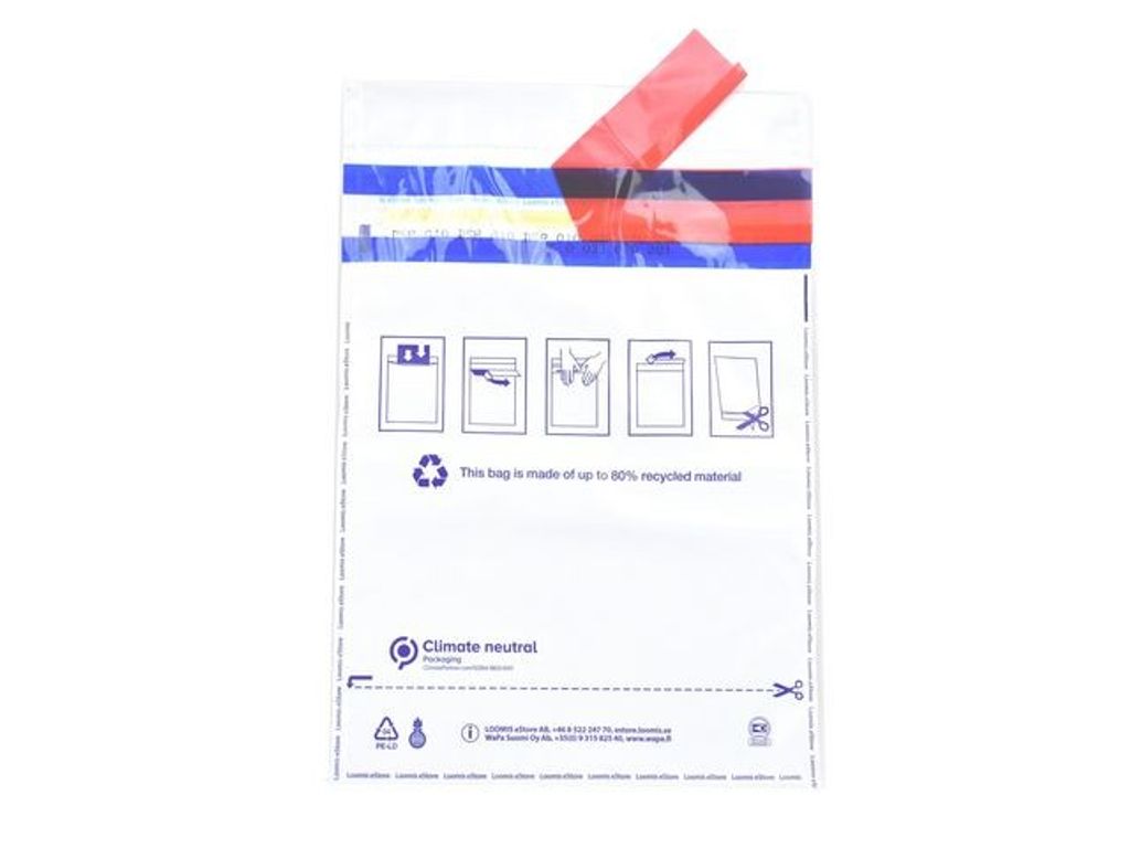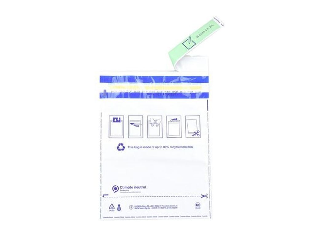 Ogenomsynligt säkerhetskuvert motsvarande C5-storlek. Testad och godkänd med intyg av SBSC. Varje säkerhetspåse är unikt numrerad med siffror och streckkod, code 128. Avrivbar numrerad kontrollremsa ovanför förslutningen. Påsen går inte att öppna och återförsluta utan att det syns direkt, vare sig med hjälp av värme, kyla, kemikalier eller mekanisk åverkan. - Mått: 190x260mm+30mm