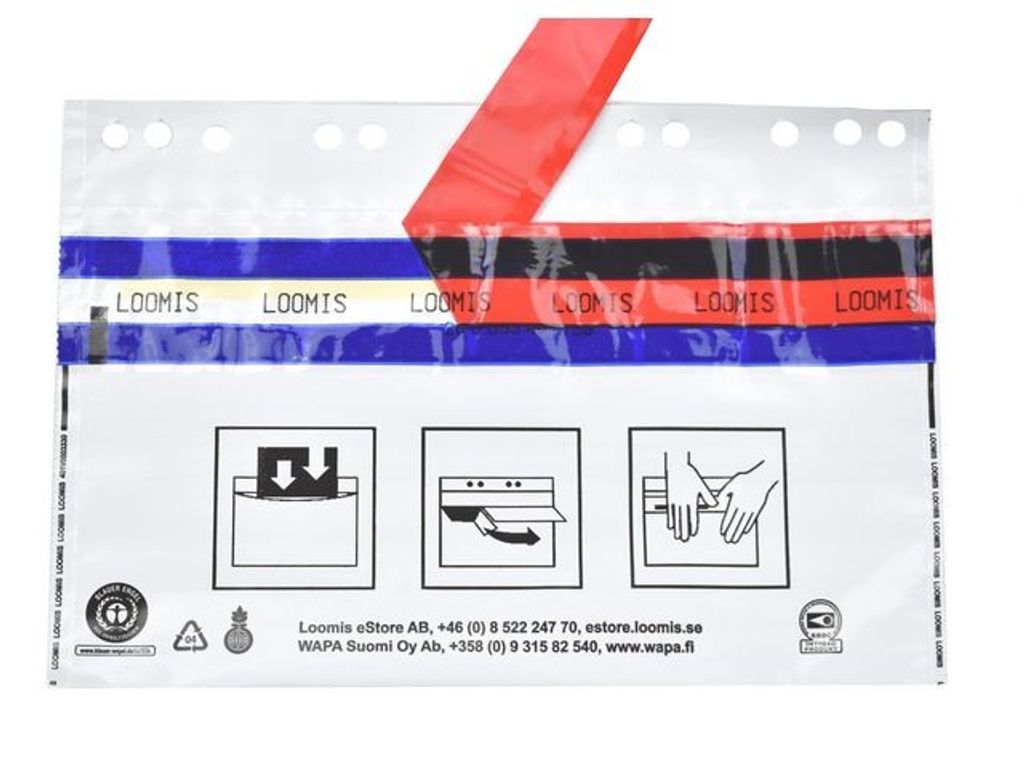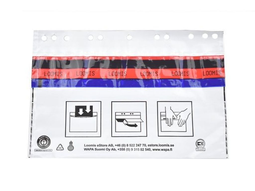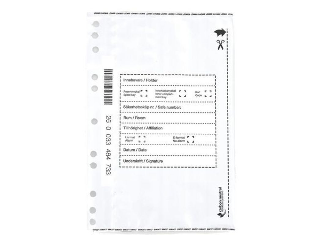 Säkerhetskuvert för effektiv och säker hantering av nycklar och koder. Ogenomsynligt säkerhetskuvert för förvaring och transport av nycklar och koder. Varje kuvert är unikt numrerat med siffror och streckkod (code 128). Kuverten är försedda med stansade hål för förvaring i pärmar. Kuverten går inte att öppna och återförsluta utan att det syns direkt, vare sig med hjälp av värme, kyla, kemikalier eller mekanisk åverkan. - Mått: 250x150mm+30mm