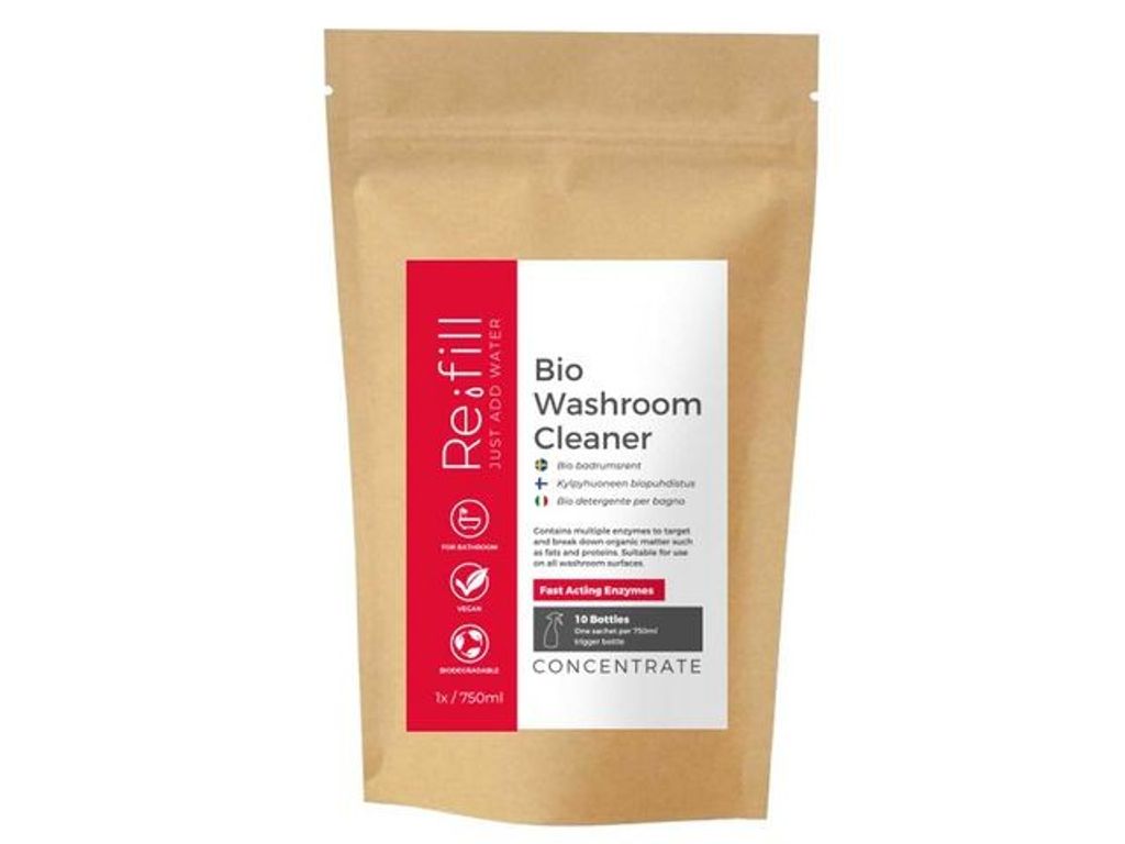 Just add water! Eliminera användningen av engångsplast - tillsätt bara vatten. Rengöringskoncentrat för professionell städning. Re:fill Bio Badrumsrent kan användas på alla hårda badrumsytor som porslin, plast och rostfritt stål. Bio Badrumsrent innehåller ett flertal enzymer som bryter ner fetter, kalk och tvålrester som kan finnas kvar i duschutrymmen. Doft av jasmin och viol. Välj ett hållbarare alternativ för en plastfri städning, där du återanvänder flaskan. Minska även transportmängden och spara lagerutrymme. Koncentratet finns i vattenlösliga kapslar. Varje påse innehåller 10 st kapslar. Varje kapsel är exakt doserad för att ge 750ml färdig lösning. 1. Fyll upp flaskan med vatten, 2. Lägg i kapseln, 3. Skaka, 4. Rengör. Samtliga produkter i Re:fill serien framställs av över 90%+ naturliga ingredienser. Tillverkningen sker med hållbarhet i fokus och etiskt utan djurförsök. Certifierad av The Vegan Society. Flaskan på 750ml säljs separat och kommer med en dubbelmunstycke för applicering som spray eller skum. Kom ihåg att spara och återanvända flaskan. - 100% återvinningsbara förpackningar - Eliminerar användningen av engångsplast - pH-värde: xx - Lukt: Parfymerad - Utseende: Tabletter