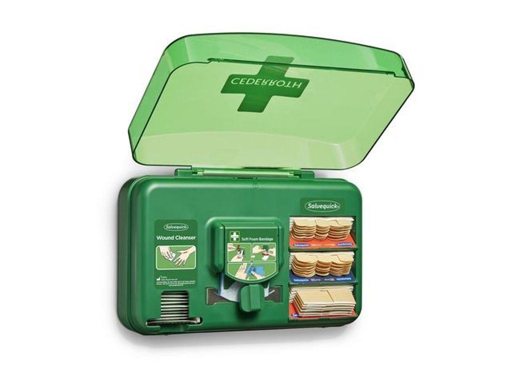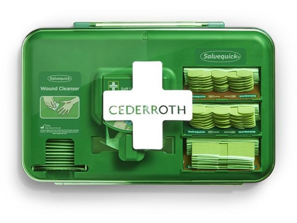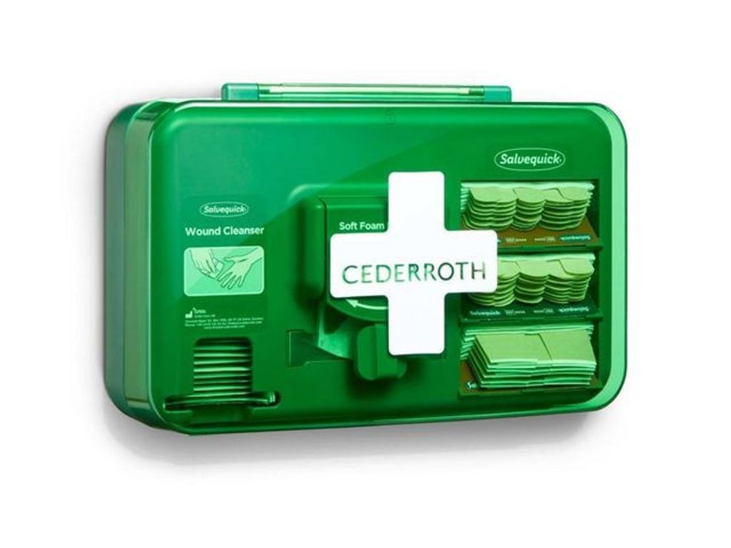Cederroth Wound Care Dispenser innehåller det mesta du behöver för att ta hand om mindre sårskador i en praktisk dispenser. Cederroth Wound Care Dispenser innehåller Soft Foam Bandage Blue, ett självhäftande, limfritt plåster som sitter kvar även i vatten. Dispensern innehåller även Sårtvättare samt en större mängd plåster i olika storlekar. Wound Care Dispenser är ett smart komplement till Första Hjälpen-stationen och placeras där du löper stor risk att få skärsår. Innehållet hålls fräscht bakom den dammskyddande luckan och fylls på med hjälp av den medföljande refillnyckeln. - Innehåll: - Salvequick Sårtvättare 40 st (REF 3227) - Cederroth Soft Foam Bandage Blue 4,5 m (REF 51011010) - Salvequick Textilplåster 40 st (REF 6444) - Salvequick Plastplåster 45 st (REF 6036) - Salvequick XL Textilplåster 21 st (REF 6470) - 1 Refillnyckel - Mått (LxBxH): 203x306x155mm