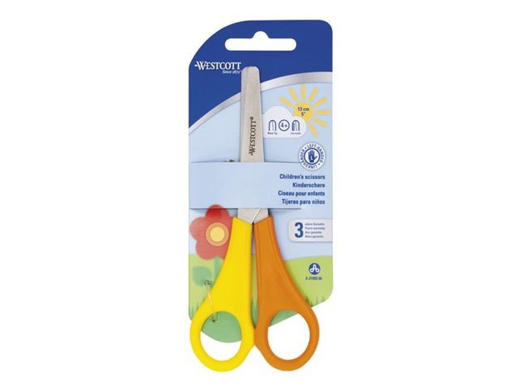Klipp papper och kort med den här barnsaxen för vänsterhänta från Westcott Klipp hörn och vackra former med den söta barnsaxen för vänsterhänta från Westcott. Saxen har rundade blad som förhindrar olyckor när barnen använder dem. Därför kan de användas både i klassrummet och hemma. - Material: Rostfritt stål - Handtag/grepp av PP - För vänsterhänta - Rundad spets - 5 cm skala på bladet - Längd: 13 cm - Färg: gul/orange - 3 års garanti