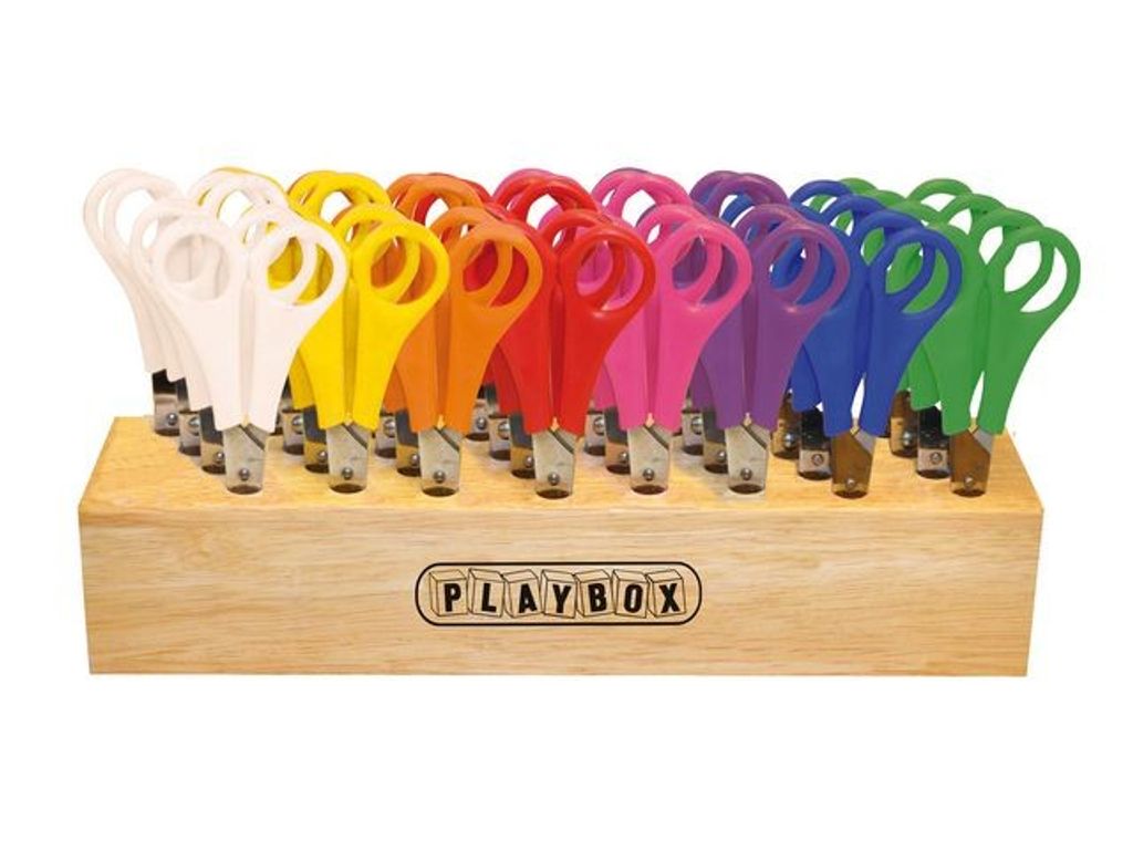 Klassuppsättning med saxar både för höger- och vänsterhänta. Saxar med olikfärgade handtag i saxställ gör det praktiskt och lätt att hålla ordning. - 4 vänstersaxar - 28 högersaxar - Antal: 32st - Saxlängd: 13cm - Saxställ: 29 x 6 x 7cm - Material sax: PP, rostfritt stål - Material saxställ: trä