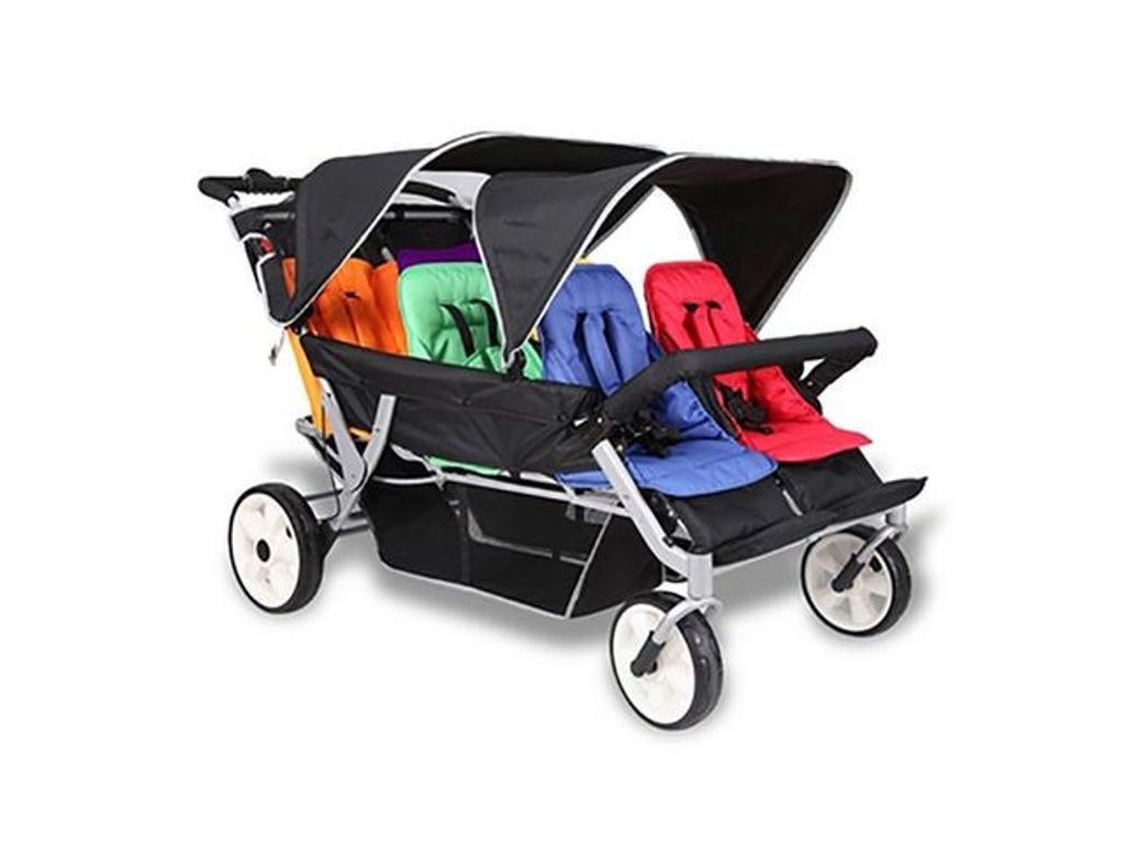 Praktisk och skön vagn för 6 barn. Trille Buss är en praktisk vagn med 6 stoppade säten i 6 olika färger och två flyttbara sufletter. Varje säte kan bära upp till ca 18 kg. Vagnen är utrustad med stora korgar med mer utrymme för förvaring. Ramen är tillverkad av lättviktsstål för enklare hantering och kan fällas med två händer samtidigt. Låsbar fotbroms. Tyget är vattenavstötande vilket gör den lätt att rengöra. Vagnen är utrustad med justerbart fotstöd och kraftiga10 'EVA framhjul / 12' bakhjul EVA det gör enheten lämplig för att köras på alla typer av vägar. Sätena på vagnen är inte lämplig för barn under 6 månader. Produkten uppfyller kraven enligt EN 1888 säkerhetsstandard . - Mått: - Utfälld: 155x86x96 cm - Ryggstödet (BxH): 32 x 41 cm - Sittsen (AMS): 20 x 32 cm - Förpackningsstorlek : 77x42x115 cm - Vikt: - Netto: 39,0 kg - Brutto: 43,0 kg