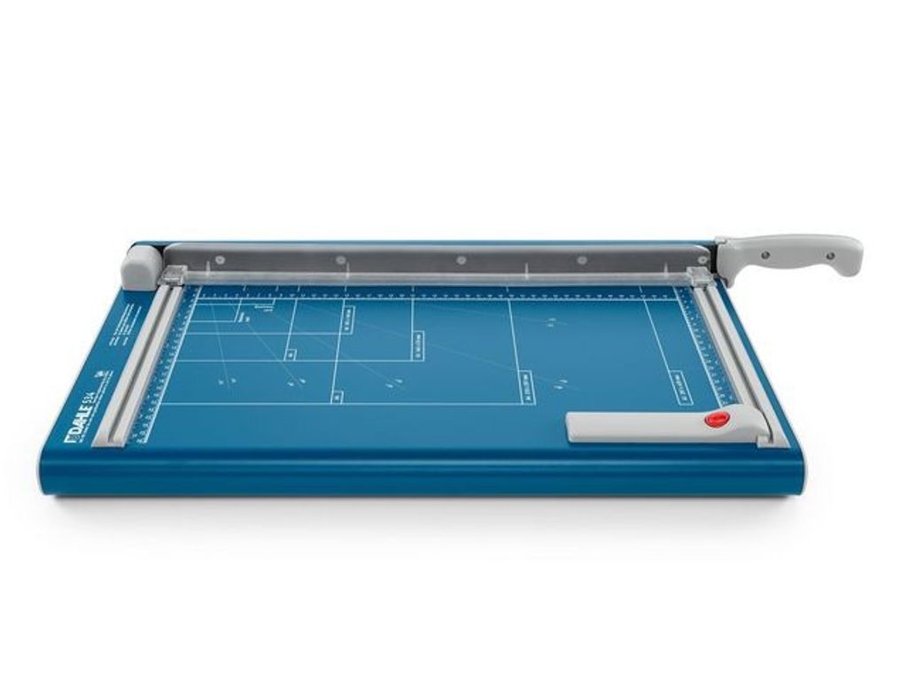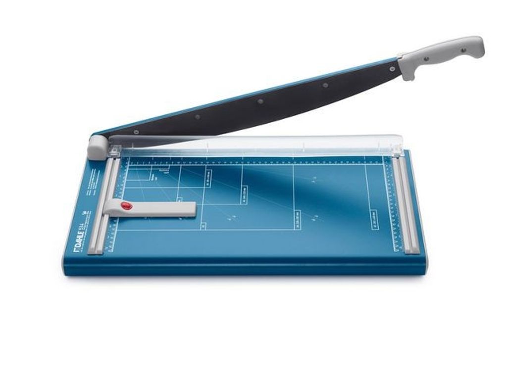 Med självslipande blad, skydd och fasthållande fjädrar är kontorsgiljotinen från Dahle det perfekta verktyget för att skära olika papperstyper. Den här kontorsgiljotinen har utformats med maximal säkerhet i åtanke, och levereras med ett skydd som även fungerar som en pappersklämma som håller dina papper på plats. Den professionella kontorsgiljotinen från Dahle har ett innovativt fjädersystem som håller fast bladet i valfri vinkel och förhindrar att det faller ned. Bladet är tillverkat i självslipande tyskt stål, vilket garanterar att det förblir effektivt även om du använder det ofta. Kontorsskärmaskinen har en skärkapacitet på 15 ark och en skärlängd på 460 mm. Det här verktyget har en kraftig botten med förtryckta ledare och en halkfri gummibas, ett perfekt val när du behöver skära papper. - Säker kontorsgiljotin med skydd - Innovativt fjädersystem håller fast bladet - Självslipande blad - Automatisk klämma som håller fast pappret ordentligt - Justerbar ledare för upprepande skärningar - Stabil metallbas med förtryckta ledare - Halkfria gummifötter förhindrar att enheten glider - Ett övre och ett nedre blad, tillverkade i högkvalitativt stål - Kapacitet: 15 ark - Skärlängd: 460 mm - Vikt: 4,9 kg - Mått: 585 x 285 mm - Färg: Blå