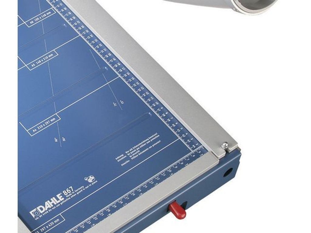 Beskrivning av Skärmaskin DAHLE 867 Kvalitativ skärmaskin som skär rakt, snabbt och proffsigt! De vanligaste pappersformaten är inritade. Roterande säkerhetsskydd. Automatisk presskena. Skärlängd 46 cm. Skärkapacitet 3,5 mm. Bordsmått L x B: 513 x 365 mm. 5 års garanti.