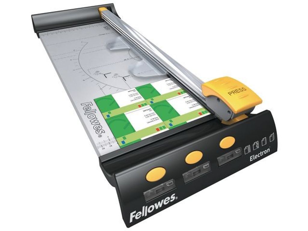 Rullskärmaskin för A3-format – lämplig för mindre omfattande uppgifter. Rullskärmaskin, Fellowes Electron. Med unik SafeCut LED-guide som är mer exakt än rullskärmaskiner med laser. Skärbladet byts enkelt ut så att man utan problem kan byta mellan rakt skär, vågformigt skär, fals/bockning och perforering. SafeCut- klingan blottas enbart när den används, vilket ökar säkerheten. - Integrerad placering av SafeCut™-klingan - Skärlängd: 46,5 cm - Skärkapacitet: 20 ark - Mått (anläggsbord): BxL 19,5 x 46 cm - Vikt: 1,6 kg - Best.enhet: styck