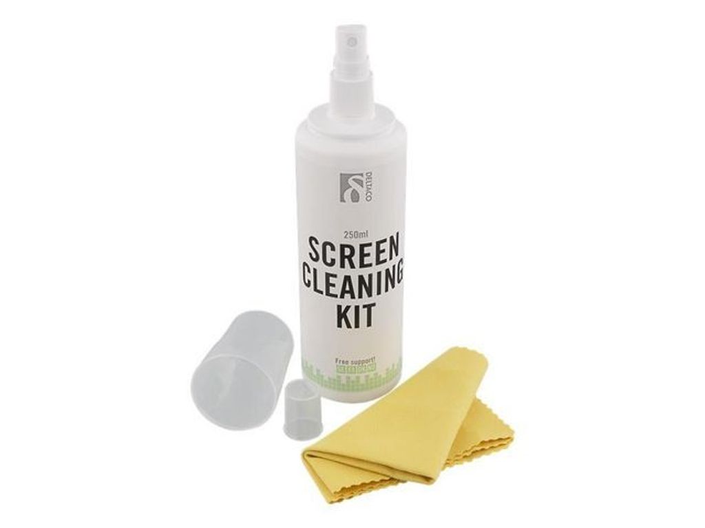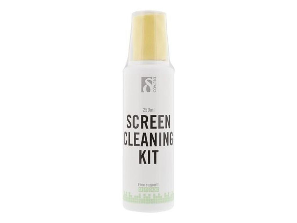 Beskrivning av Skärmrengöringskit DELTACO 250ml Skärmrengöringskit för alla typer av monitorer. Kittet består av 250ml rengöringsvätska och en microfiberduk. Microfiberduken kan handtvättas i varmt vatten. Alkoholfri och biologiskt nedbrytbar. - Microfiberduk 200x200mm